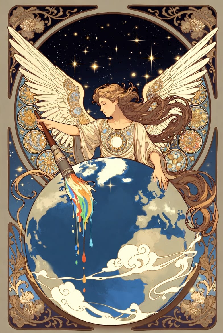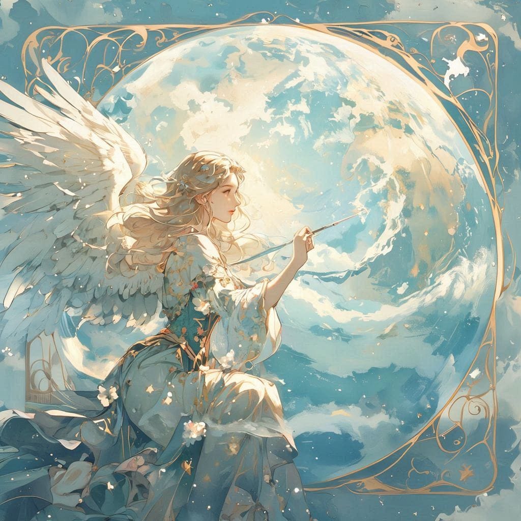 Same Prompt🤔: Create an inspiring image of an angel painting a mural of the sky on a globe of the Earth in the style of a magical Art Nouveau Anime Painting.