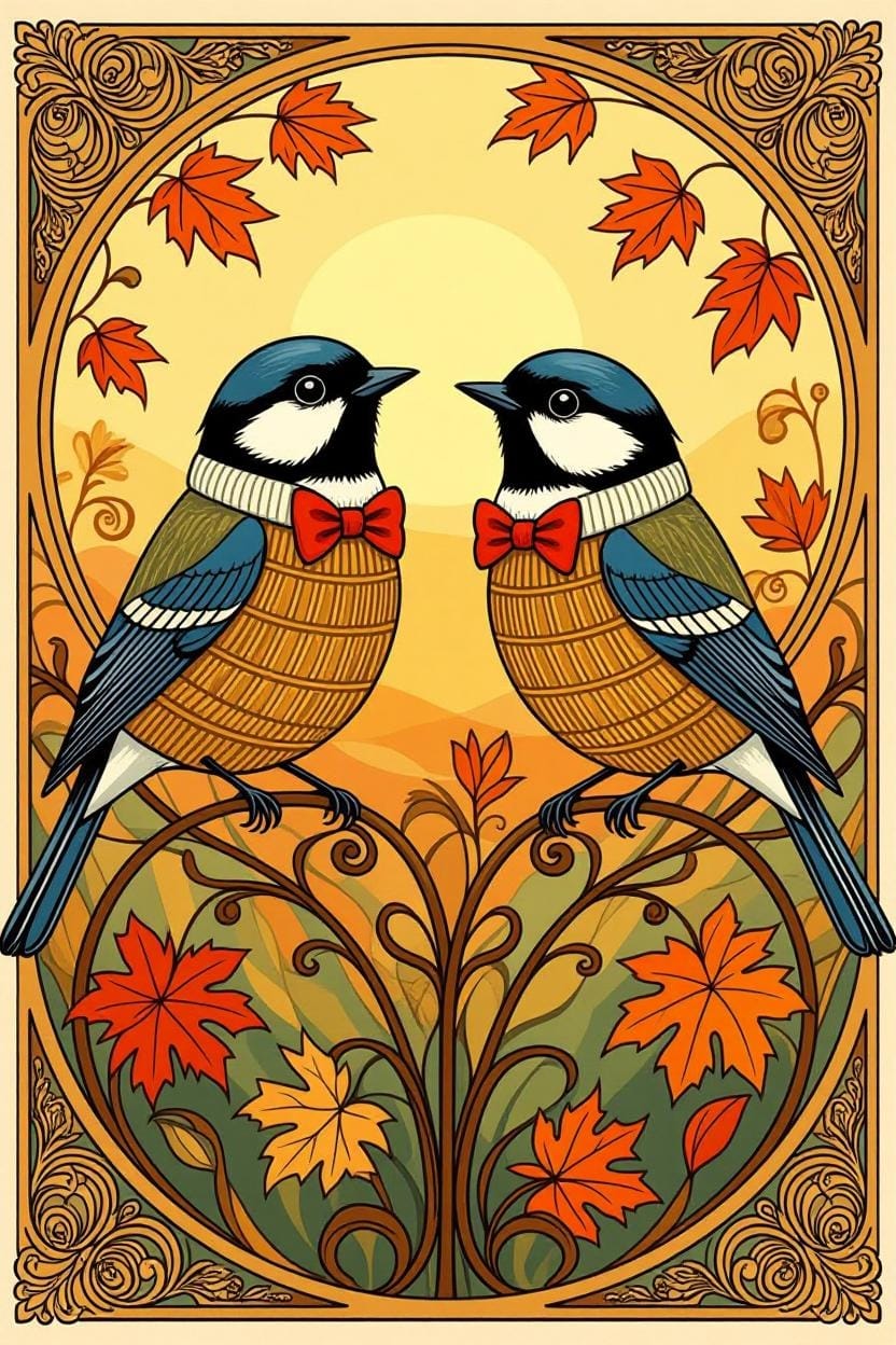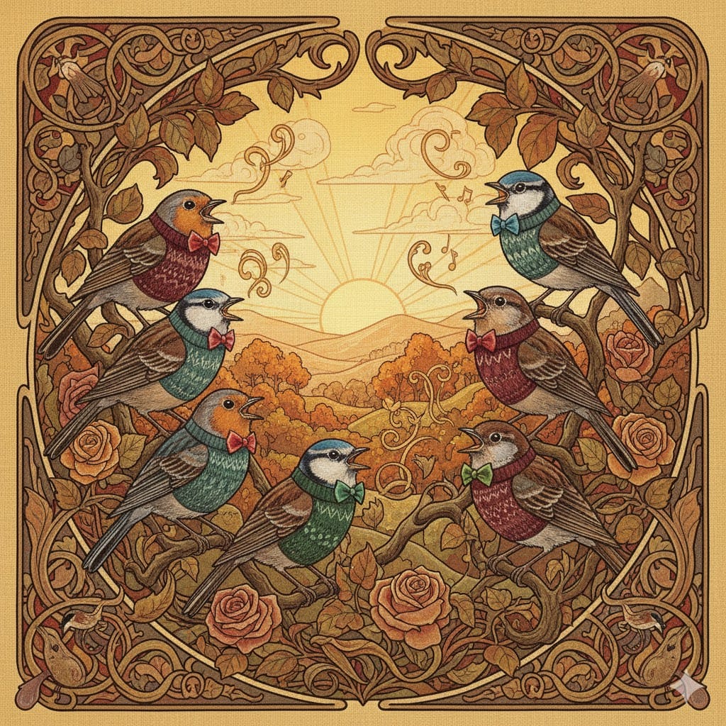 Same Prompt: Create an image of songbirds in Autumn wearing sweaters and bowties singing at dawn in the style of a magical Art Nouveau tapestry painting.