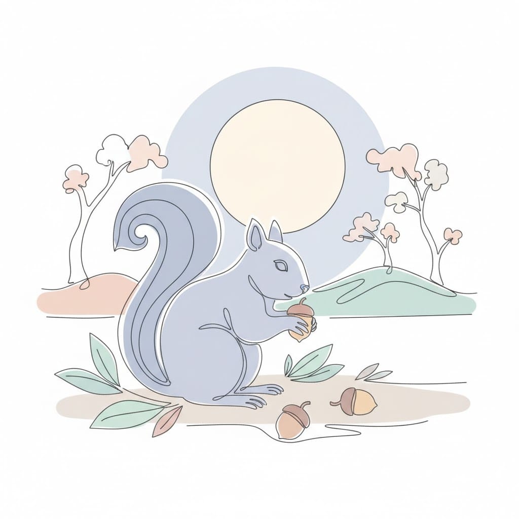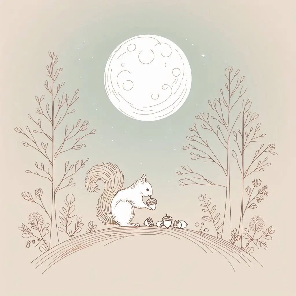 Same Prompt🤔: Create an image of a squirrel gathering acorns under a full moon in the style of a single line drawing using hushed tones and a pastel color palette.