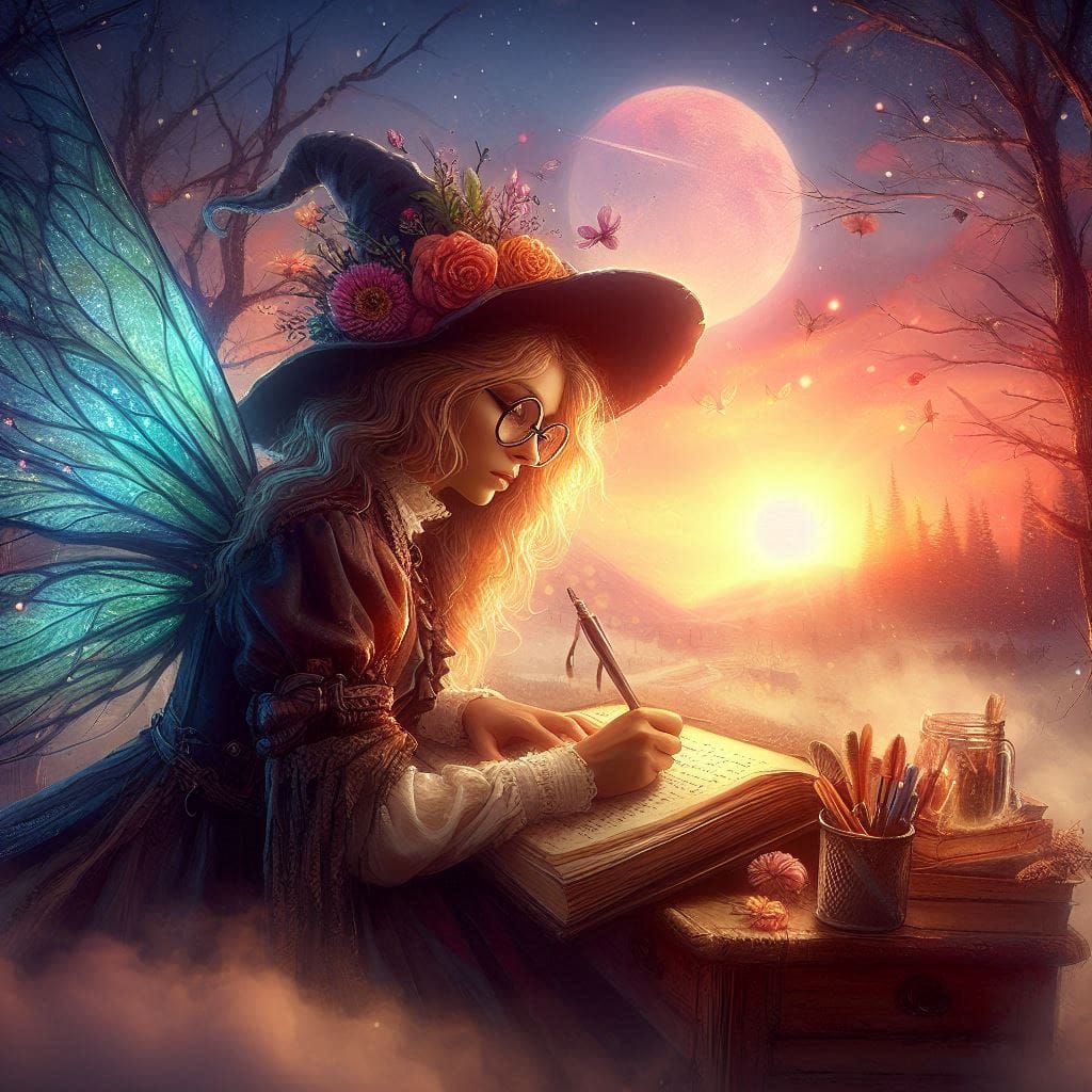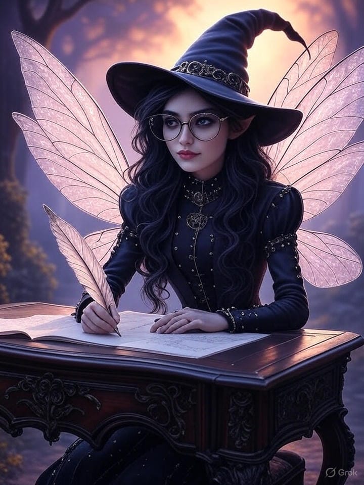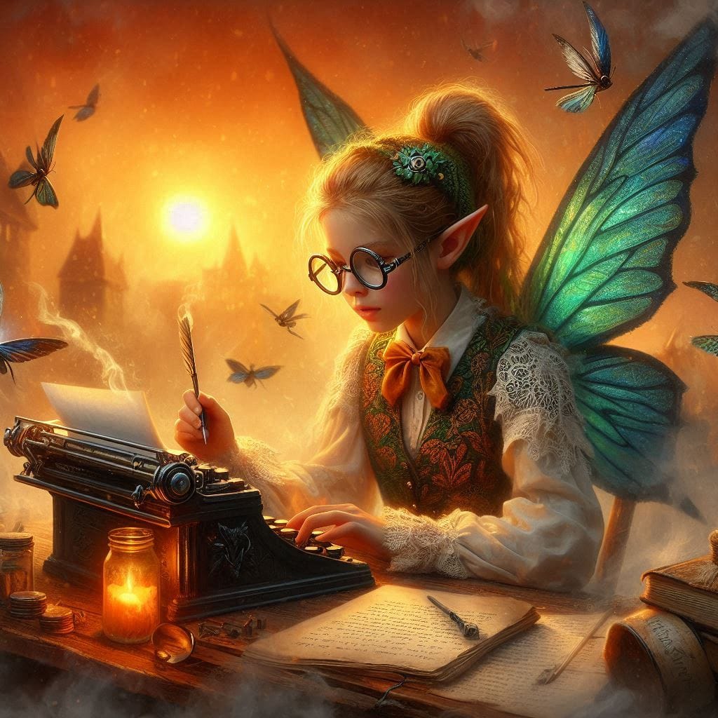 Promptly Spoke: Create an image of a faerie dressed as a nerd writing at sunrise in the style of a magical gothic dark fantasy painting.