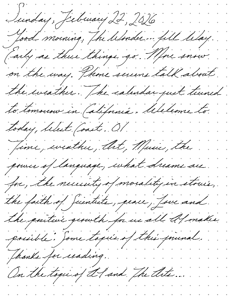 Time, Weather, Art, Music, the power of language, what dreams are for, the necessity of morality in stories, the Faith of Scientists, Peace, Love and the positive growth for us all AI makes possible: Some topics of this journal.