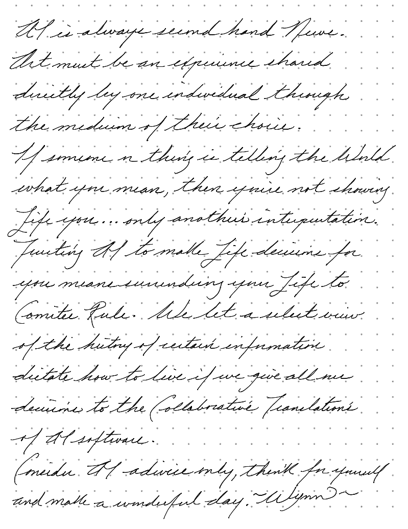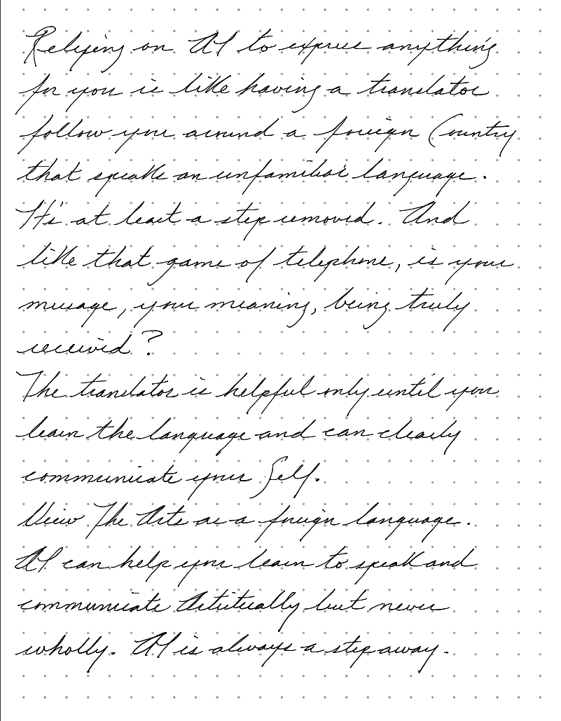 Relying on AI to express anything for you is like having a translator follow you around a foreign Country that speaks an unfamiliar language. It's at least a step removed. And like that game of telephone... is your message, and meaning, being truly received?