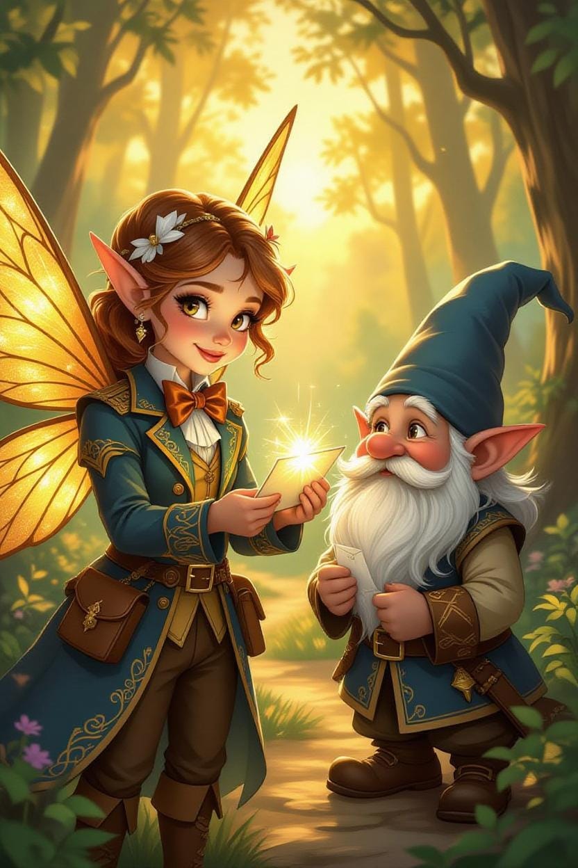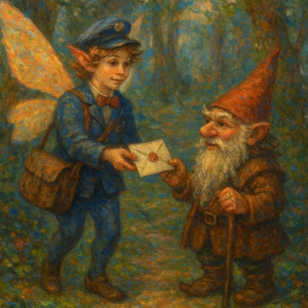 Same Prompt: Create an image of a faerie wearing a bowtie dressed as a mail carrier delivering a letter to a gnome in an enchanted forest in the style of a magical impressionist Dungeons and Dragons painting.