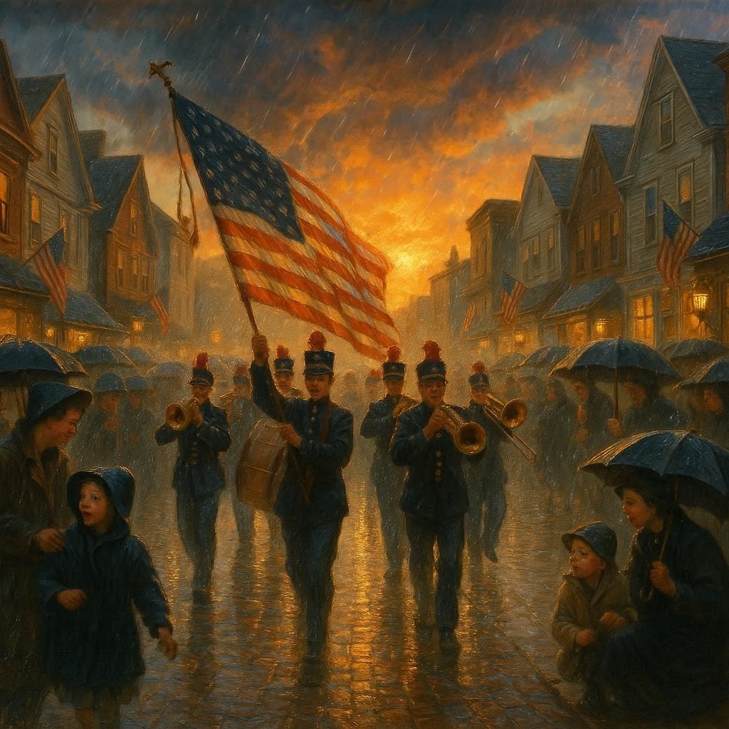 Promptly Spoke: Create an image of a parade in a small town in New England at sunrise during a rainstorm in the style of a magical Norman Rockwell painting.