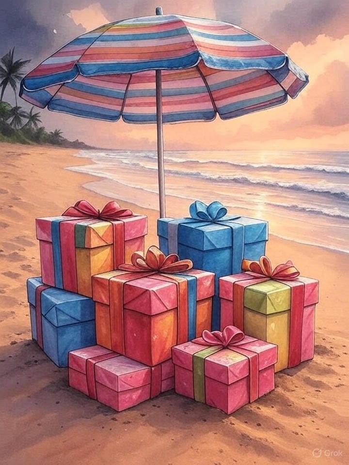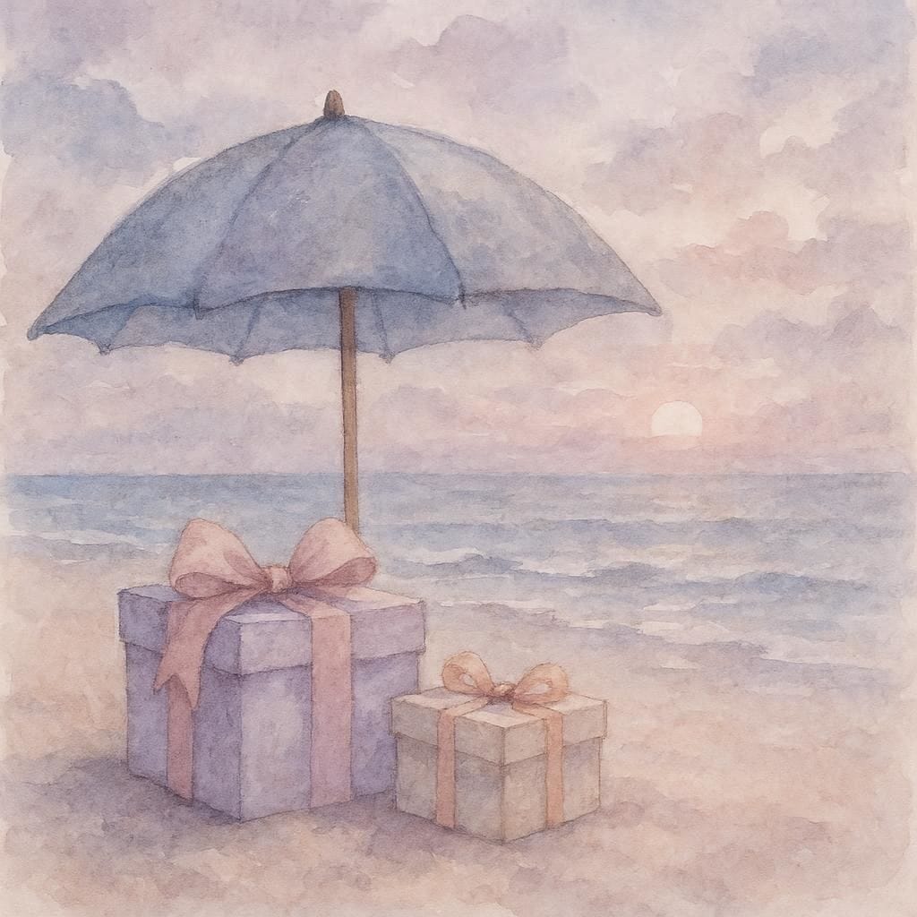 Promptly Spoke: Create an image of a couple of gifts under a beach umbrella on a cloudy day at dawn in the style of a magical watercolor painting using hushed tones.
