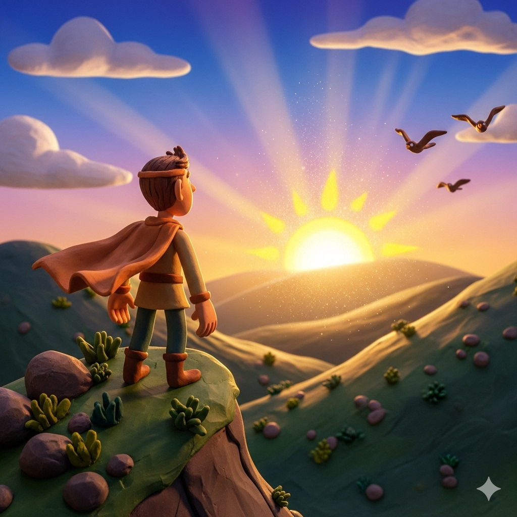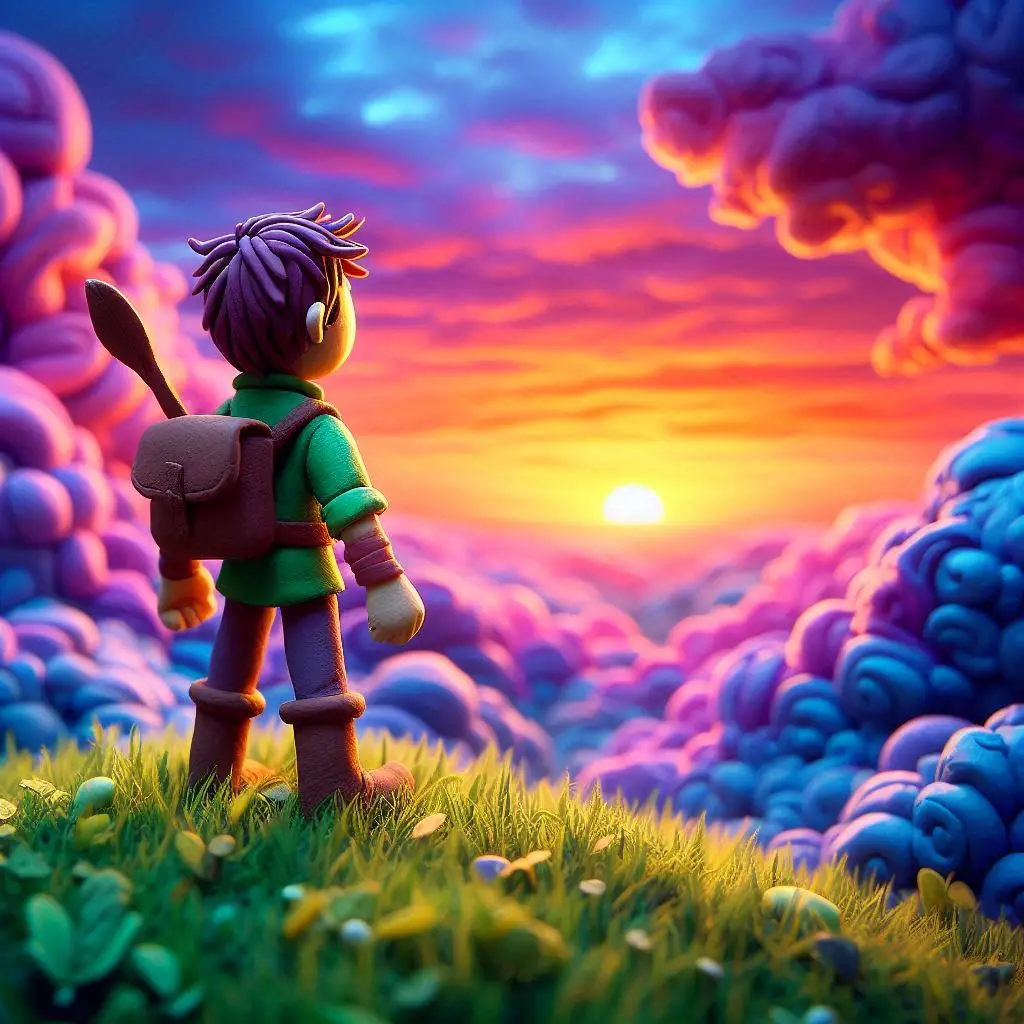 Promptly Spoke: Create an image of a hero watching a sunrise from atop a hillside in the style of magical Claymation.