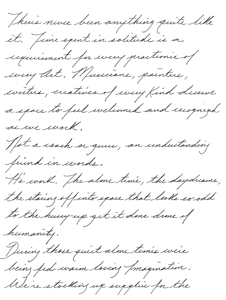 Time spent in solitude is a requirement for every practitioner of every Art. Musicians, painters, writers, creatives of every kind, deserve a space to feel welcomed and recognized as we work.