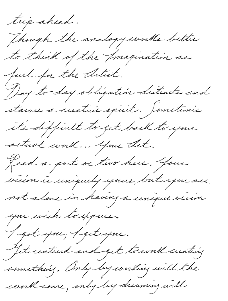 Day-to-day obligation distracts and starves a creative spirit. Sometimes it's difficult to get back to your actual work... Your Art.