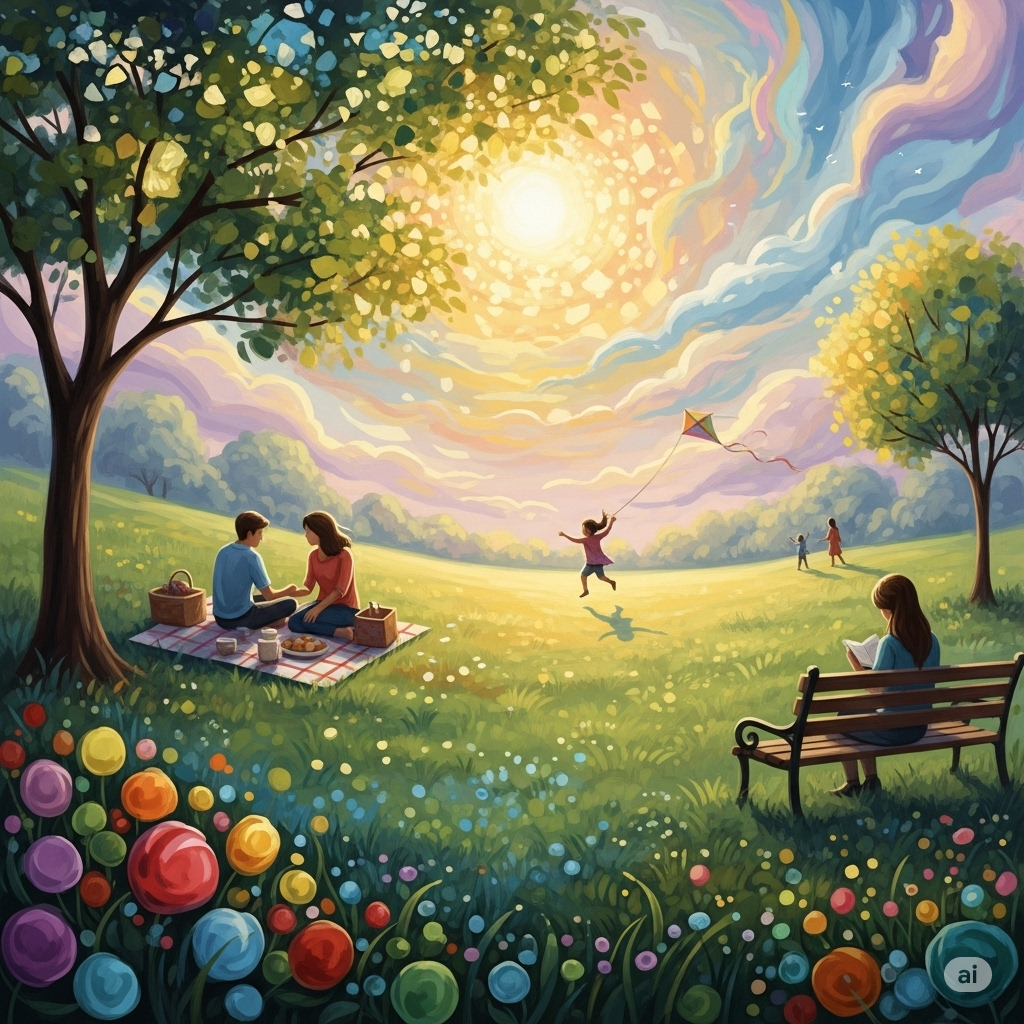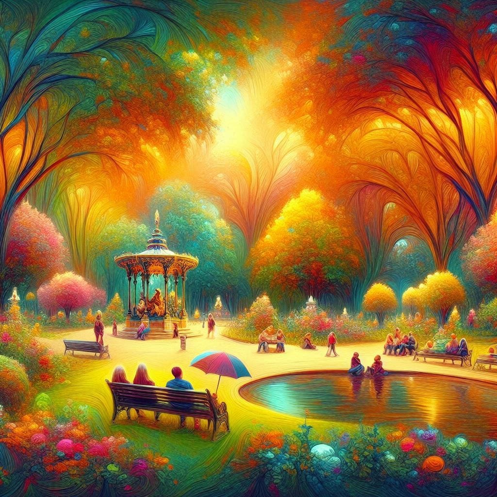 Promptly Said: Create a peaceful image of people in a park enjoying a summer's day in the style of a magical abstract realism painting.