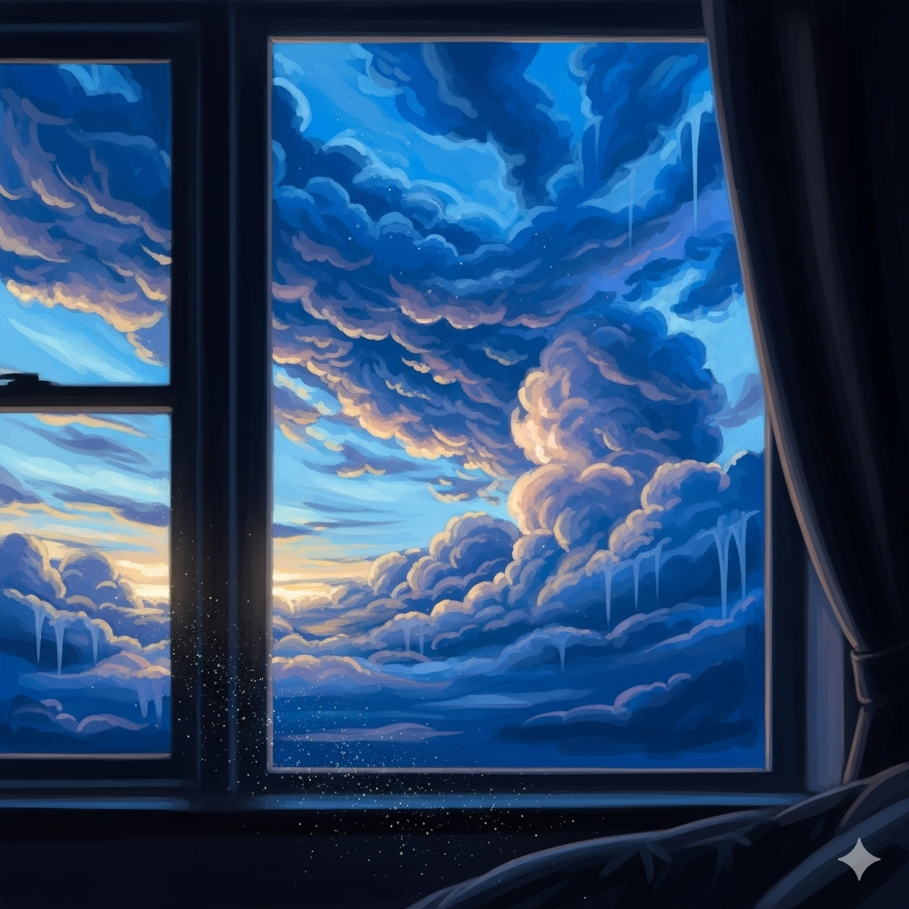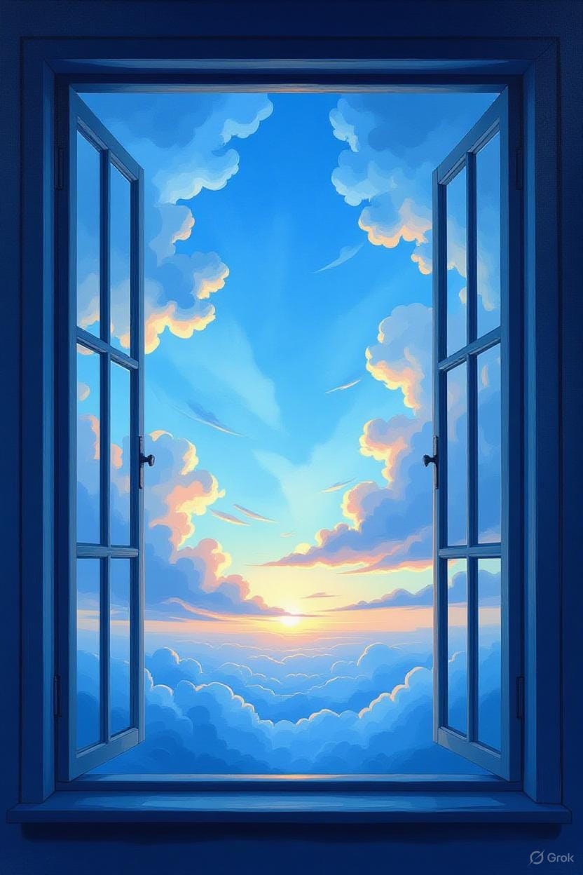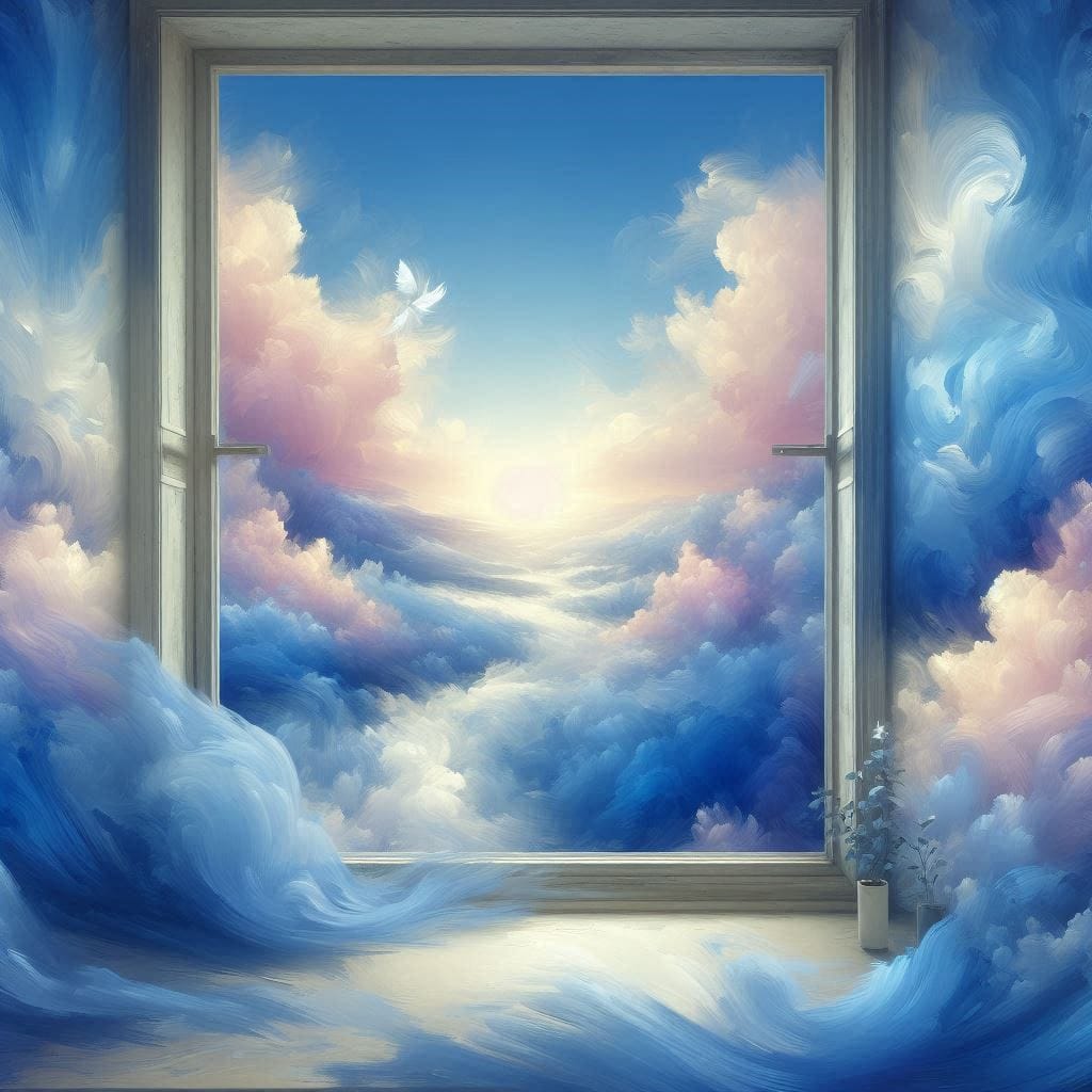 Promptly Spoke: Create an image of a view of a beautiful blue cloudy sky through a window at dawn in the style of a magical abstract realism painting using a blue color palette.