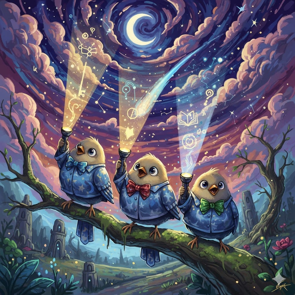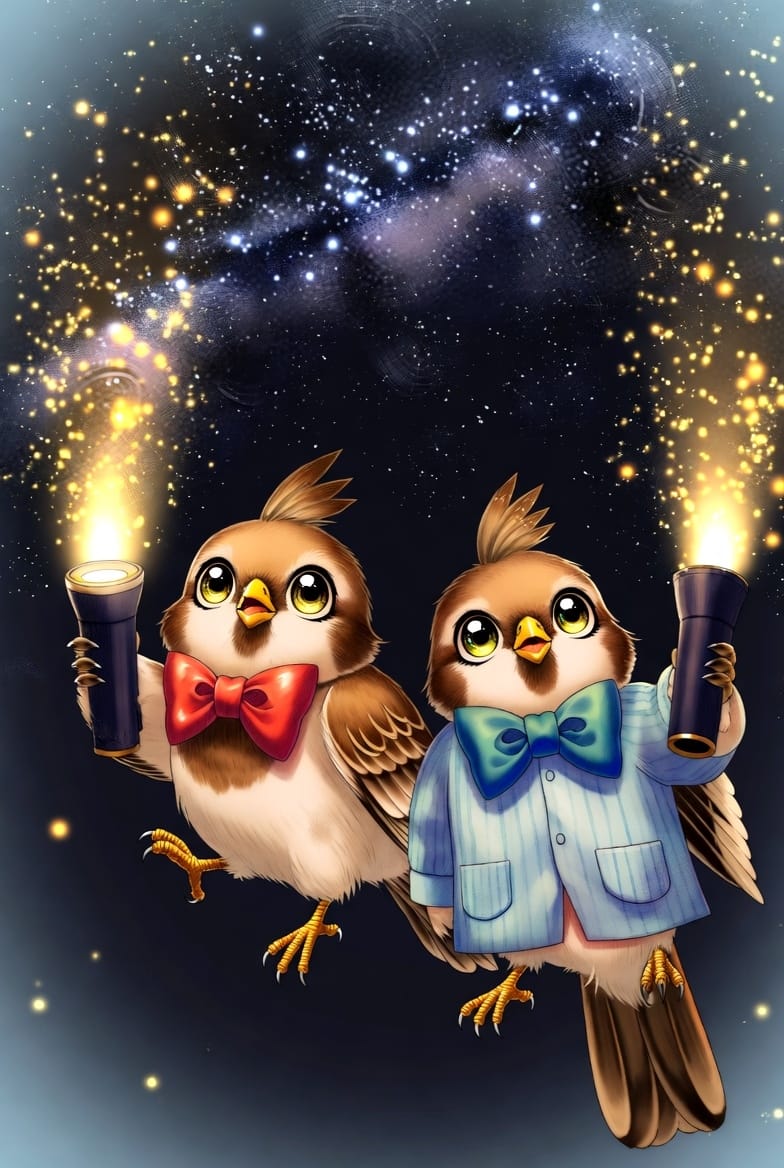 Same Prompt 🤔: Create an image of inquisitive songbirds wearing bowties and pajamas at night shining flashlights at the sky in the style of a magical anime expressionist illustration.