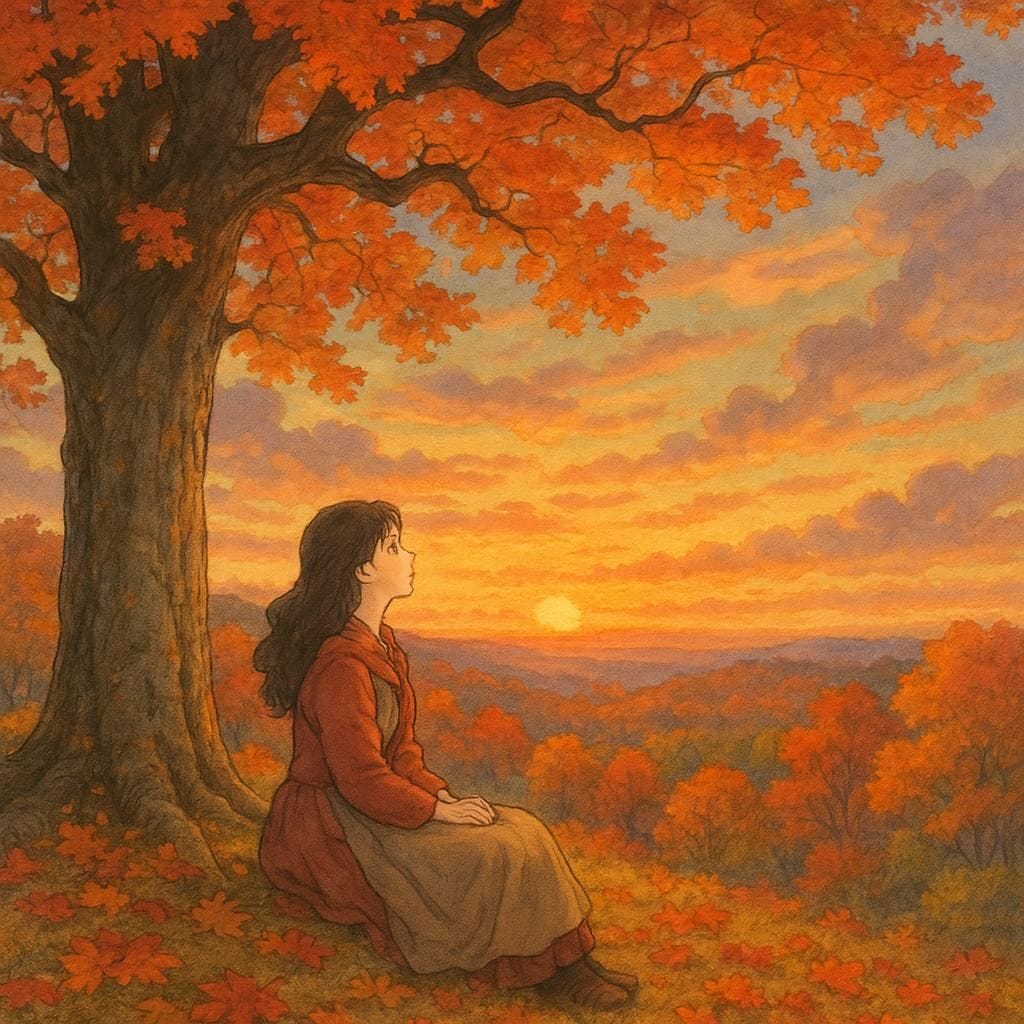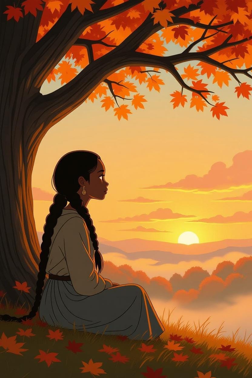 Same Prompt: Create an image of a woman watching the sky, sat under an oak tree in Autumn in New England during sunrise in the style of a magical vintage Studio Ghibli drawing.