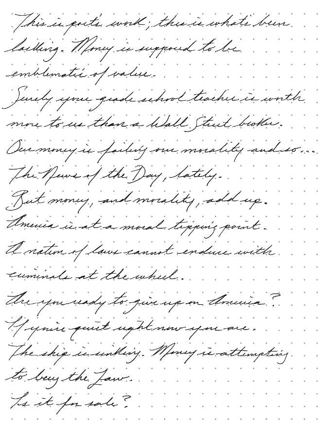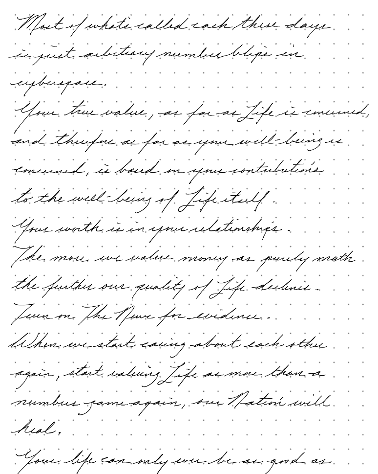 This is poet's work; this is what's been lacking. Money is supposed to be emblematic of value: not value itself.