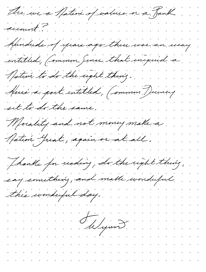 "My Country, America, has put money over morality in means of economic and social importance for too long and we're starting to pay the price for it.