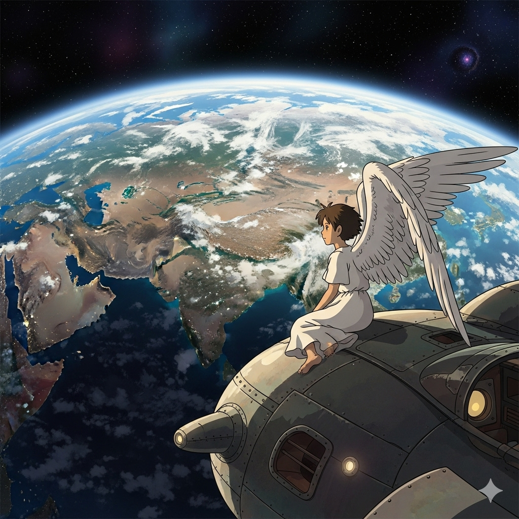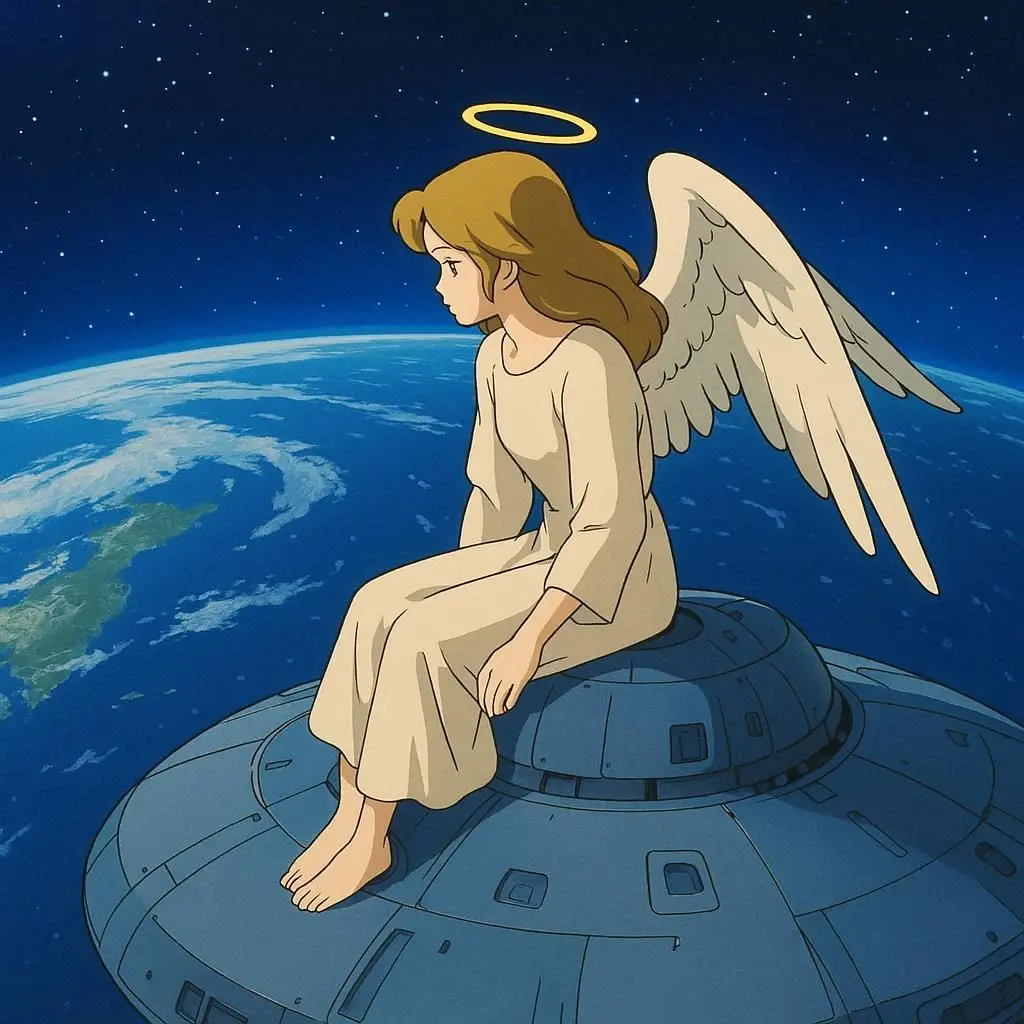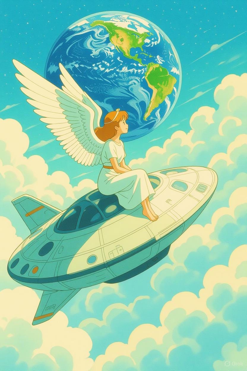 Promptly Spoke: Create an image of an angel sitting on top of a spaceship watching the Earth in the style of Studio Ghibli Animation.