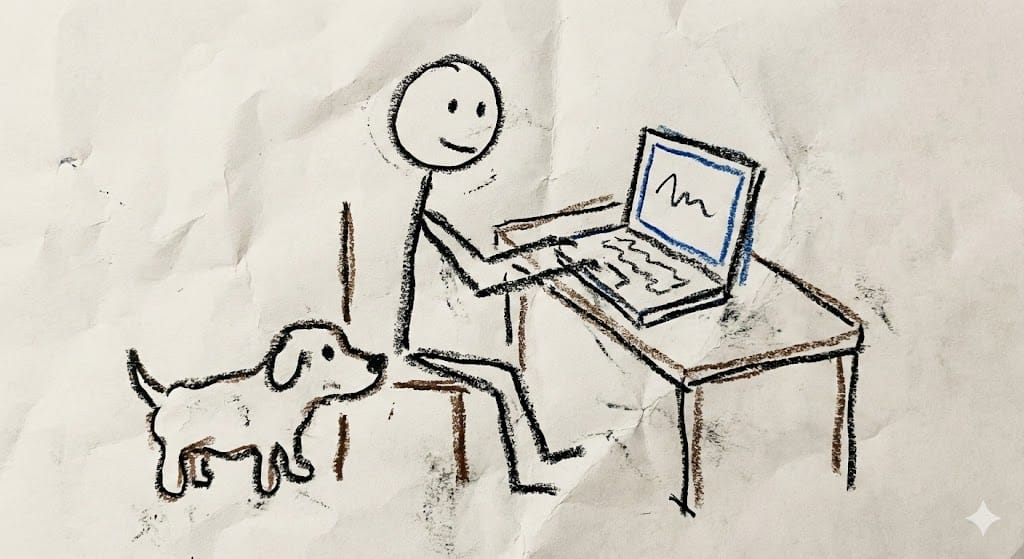 Same Prompt🤔: Create a poorly drawn stick figure drawing of a guy and his dog sitting looking at a laptop computer.