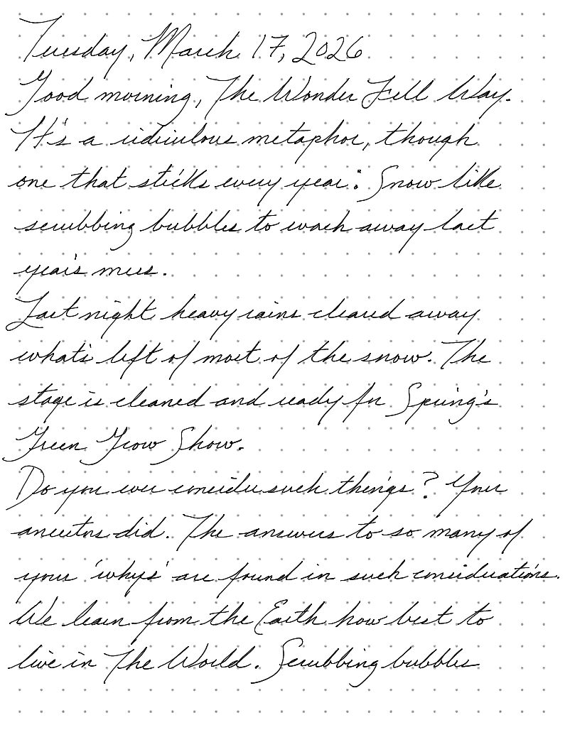 We learn from The Earth how best to live in The World. Scrubbing bubbles on kitchen counters to soak away the mess to make a clean space to cook again. Snow to prep the stage for Spring's growing ways.