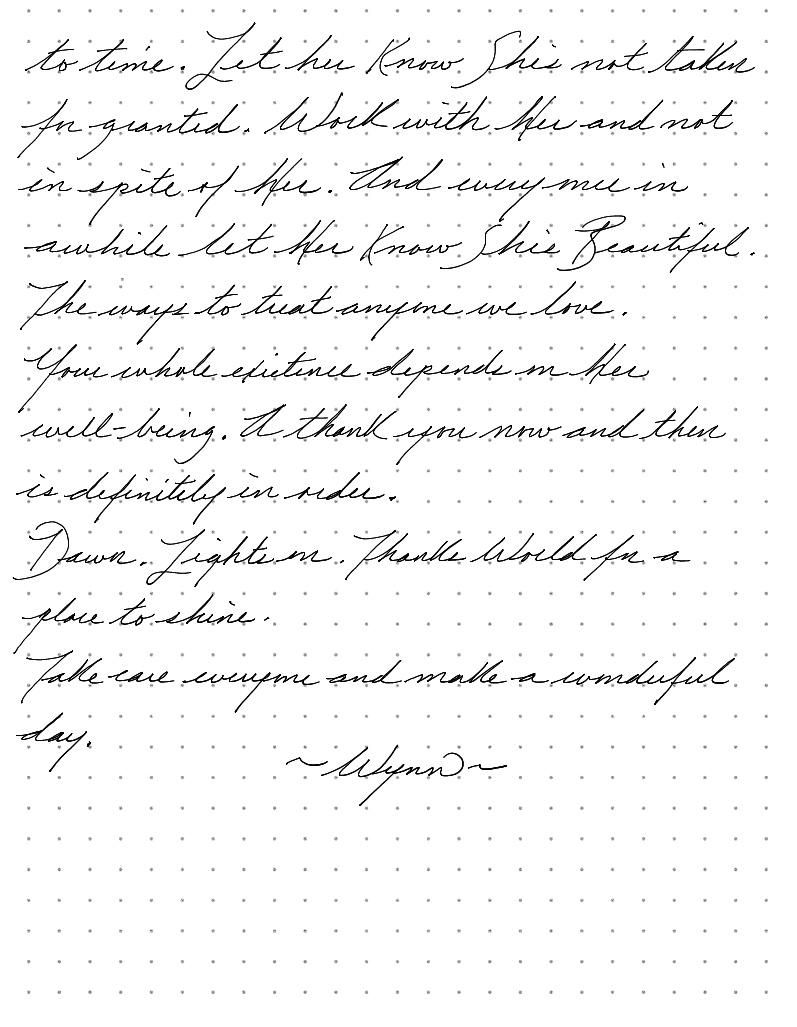 It's a simple thing to do. Let her know She's not taken for granted. Work with Her and not in spite of Her. And every once in awhile let Her know She's Beautiful.