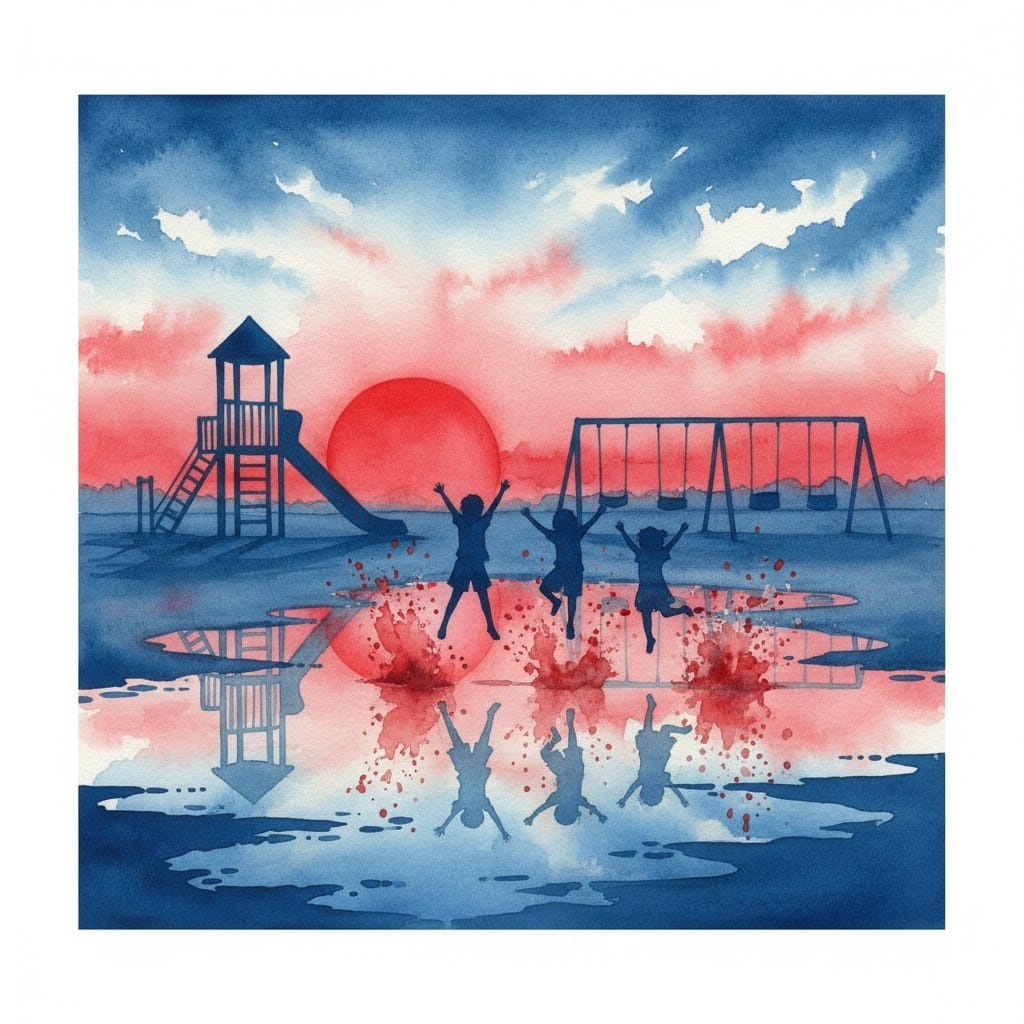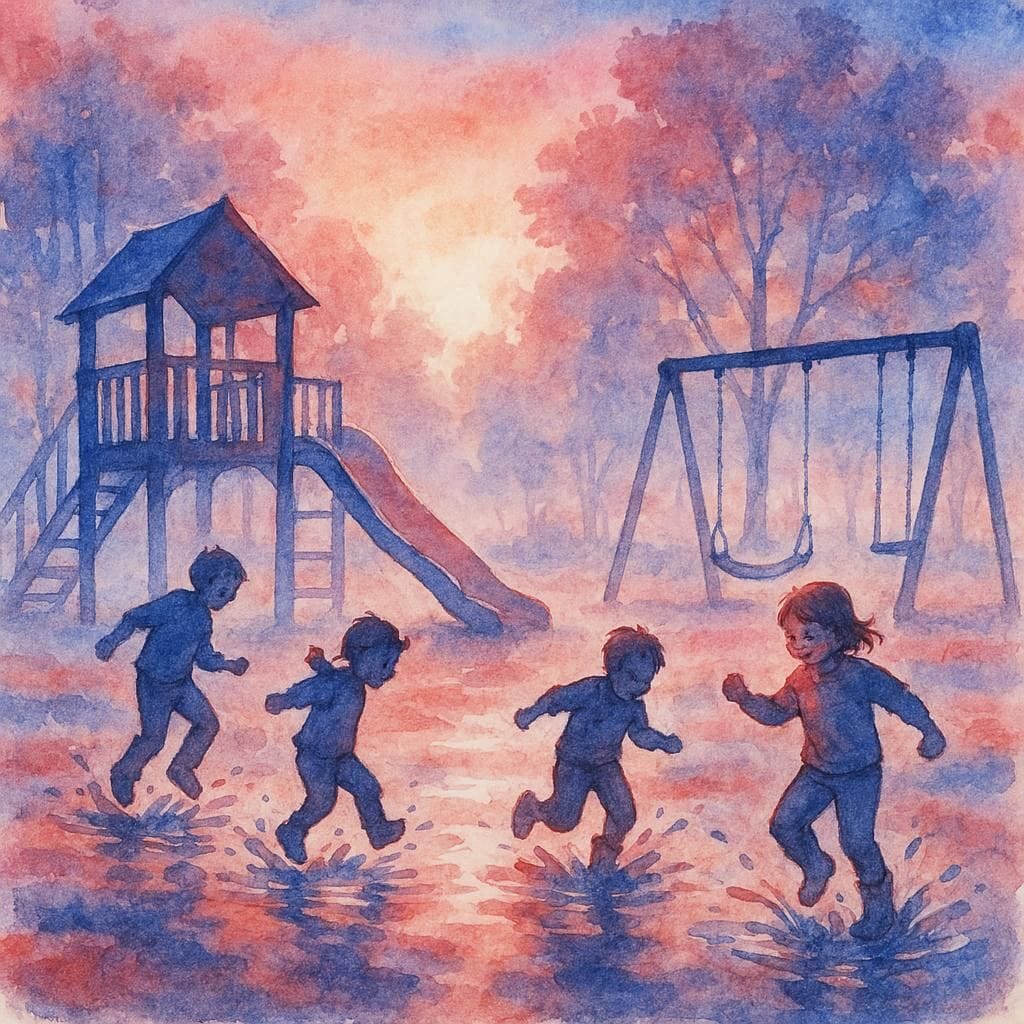 Same Prompt: Create an image of a playground at dawn with children jumping in puddles in the style of a magical watercolor wash using a red, white, and blue color palette.