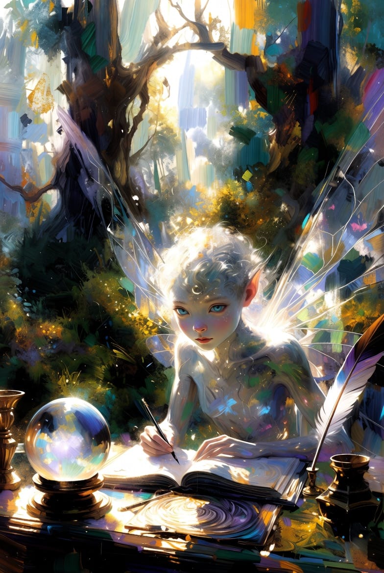 Same Prompt🤔: Create an image of an inquisitive faerie wearing a bowtie sitting at a desk in an enchanted forest writing in an ancient tome in the style of a magical abstract impressionist painting.