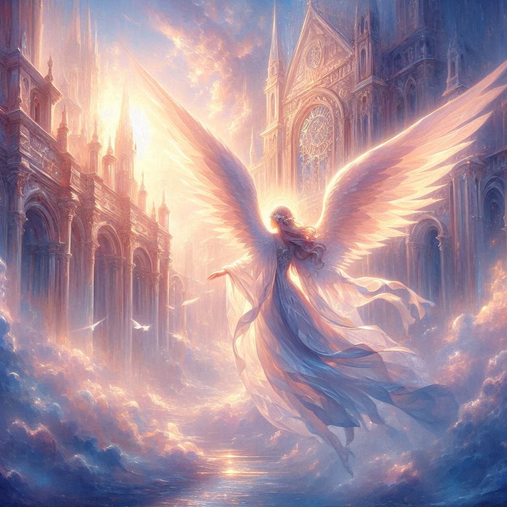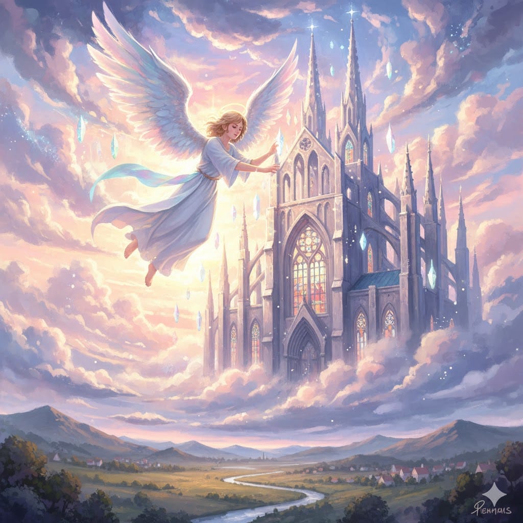 Same Prompt🤔: Create an inspiring image of an angel building a cathedral at dawn in the style of a magical anime impressionist painting.
