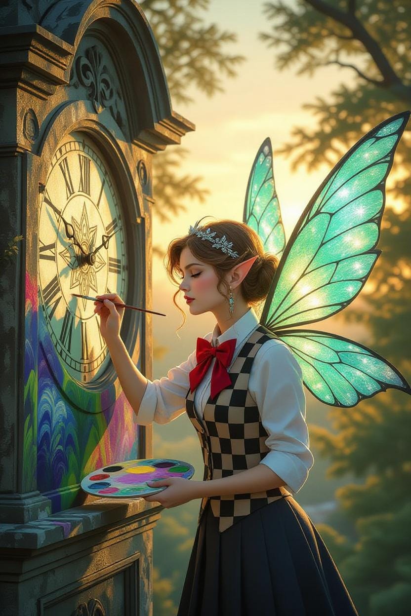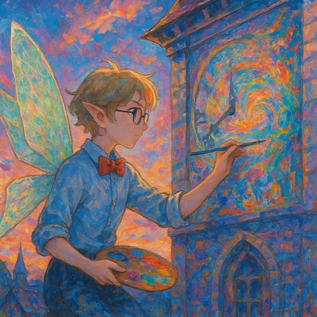 Same Prompt: Create an image of a focused faerie dressed as a casual nerd wearing a bowtie painting a mural on a clocktower in the style of a magical impressionist anime painting.
