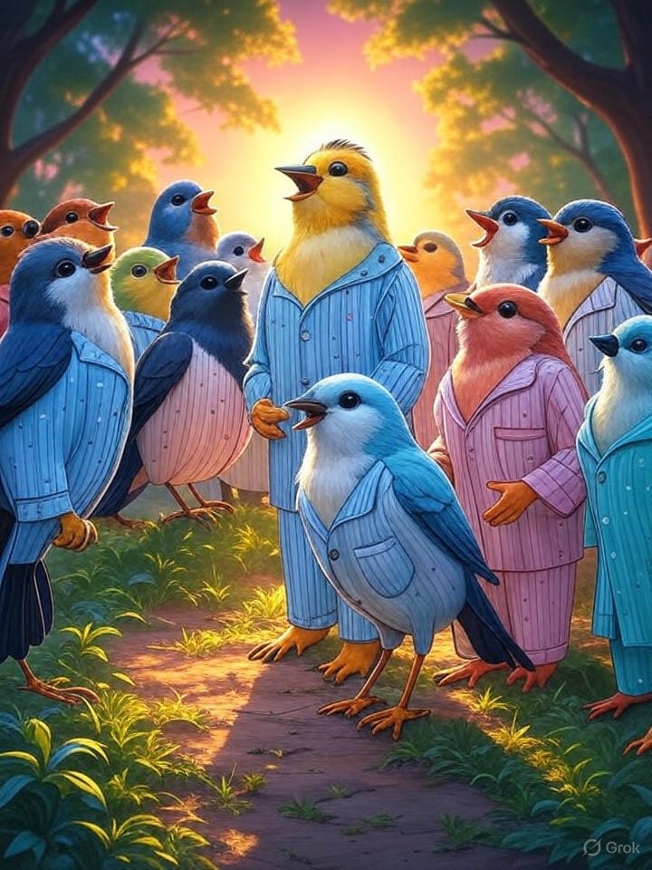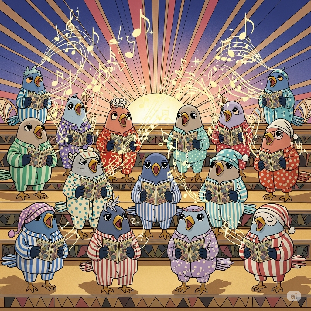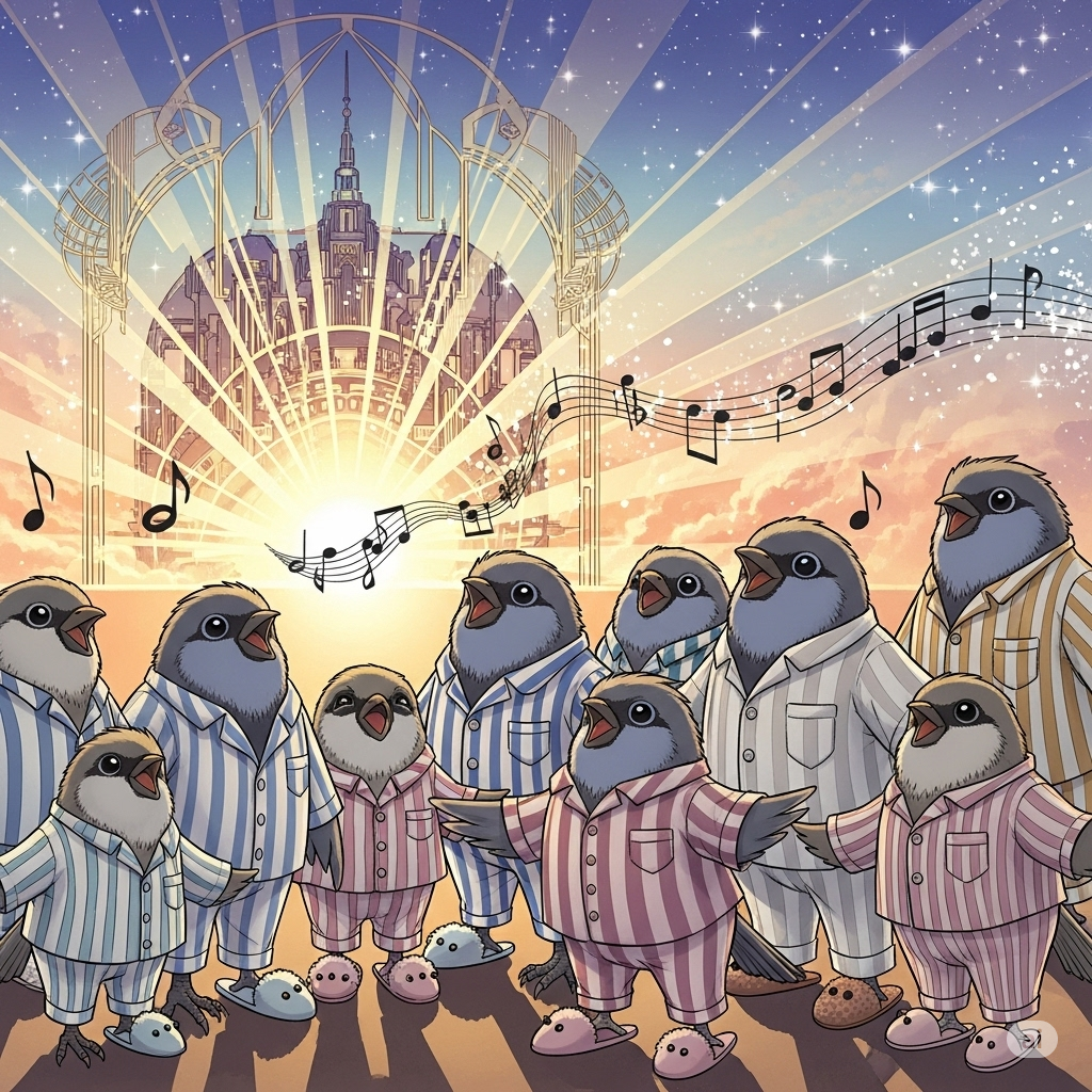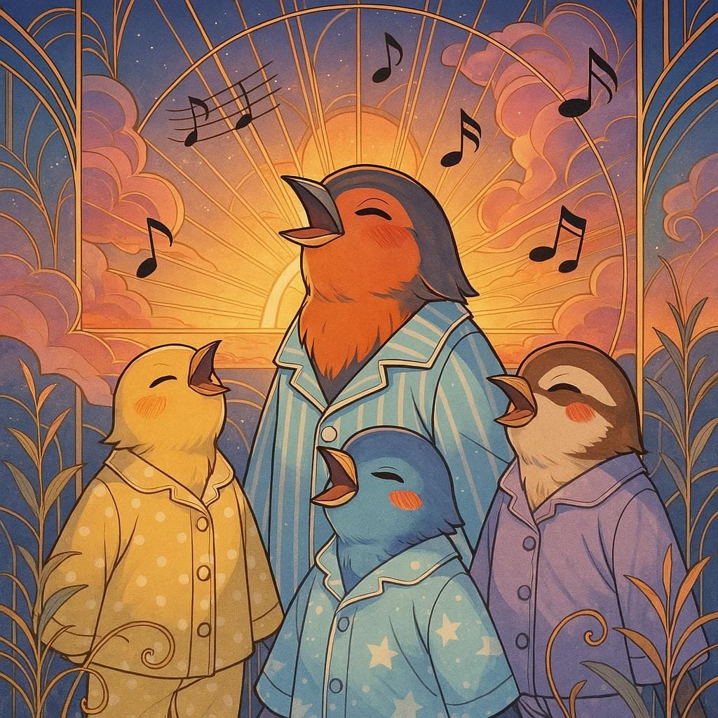 Promptly Spoke: Create an image of a choir of songbirds singing at sunrise in their pajamas in the style of a magical Art Deco Anime Illustration.