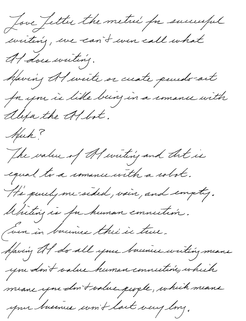 If we make the ability to write a Love Letter the metric for successful writing, we can't even call what AI does writing.