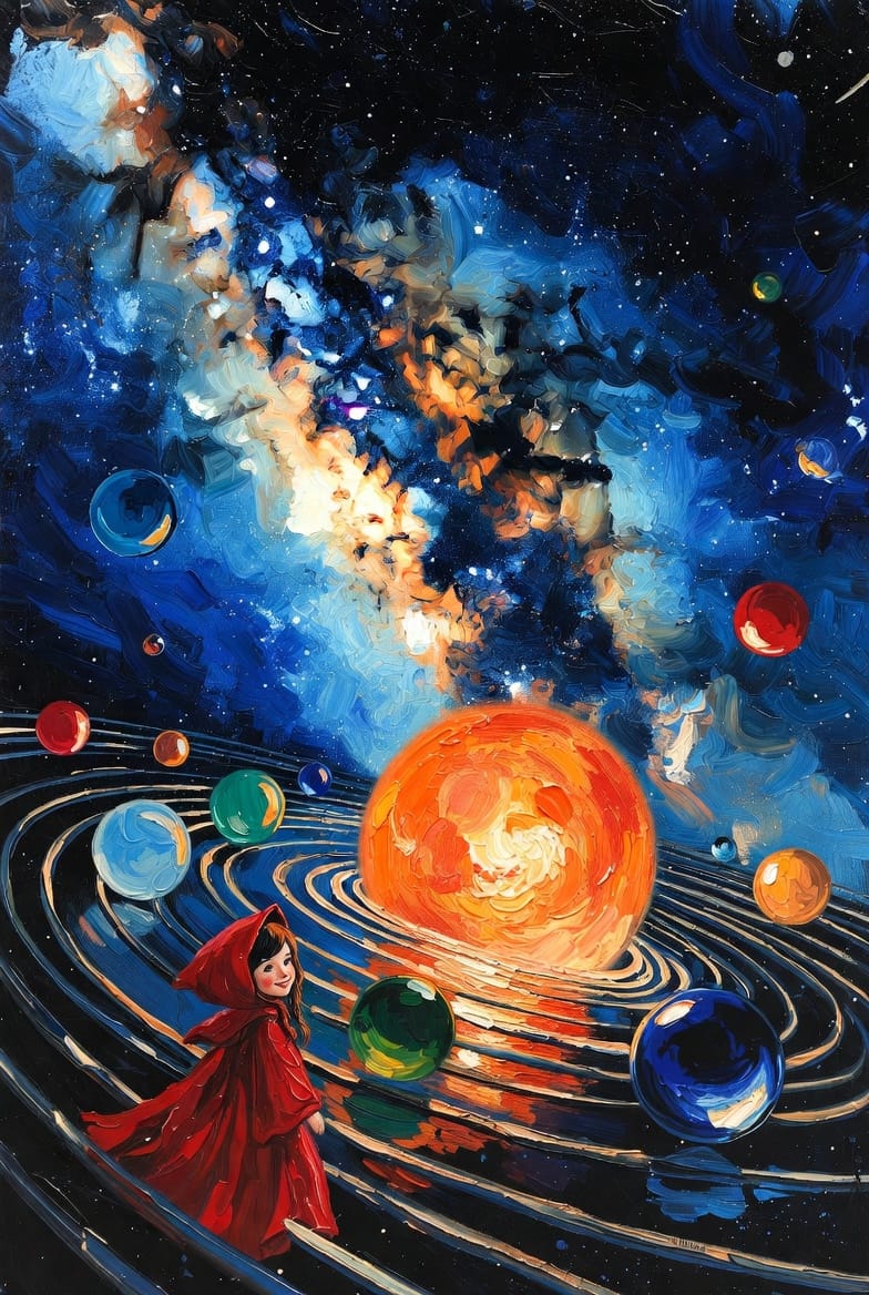 Same Prompt🤔: Create an image of the Milky Way where the planets are like marbles rolling around the Sun on a turntable while Little Red Riding Hood watches smiling in the style of an abstract impressionist painting.