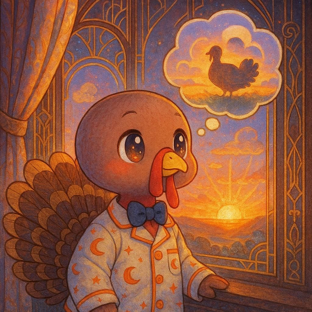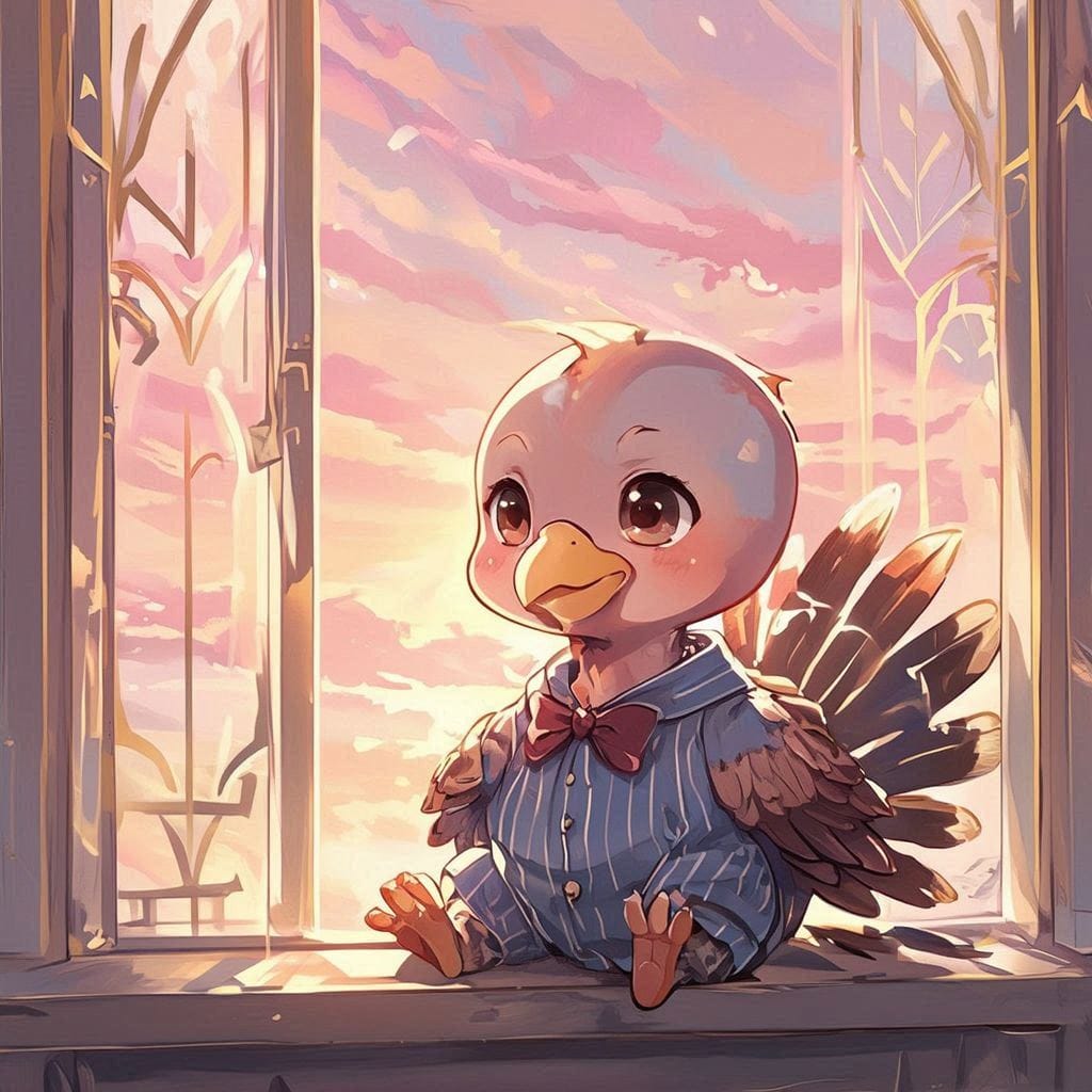 Same Prompt🤔: Create an image of a turkey wearing a bowtie and pajamas looking out a window watching the sunrise while daydreaming in the style of a magical Art Deco Chibi Anime painting.