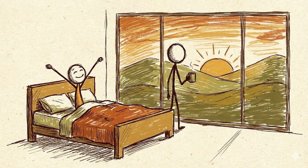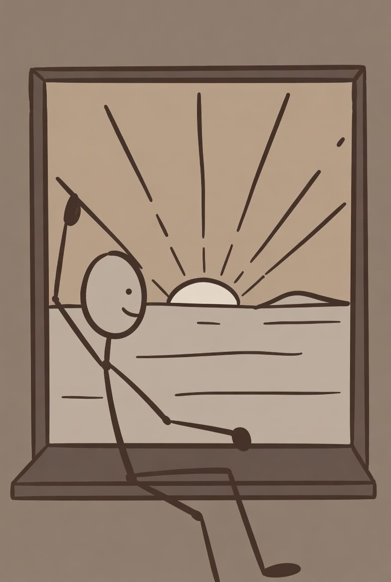 Same Prompt🤔: Create a stick figure image of a person waking up and watching the sunrise outside their window using an earthy color palette.