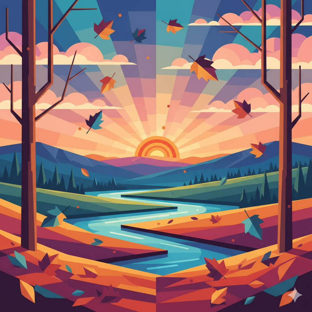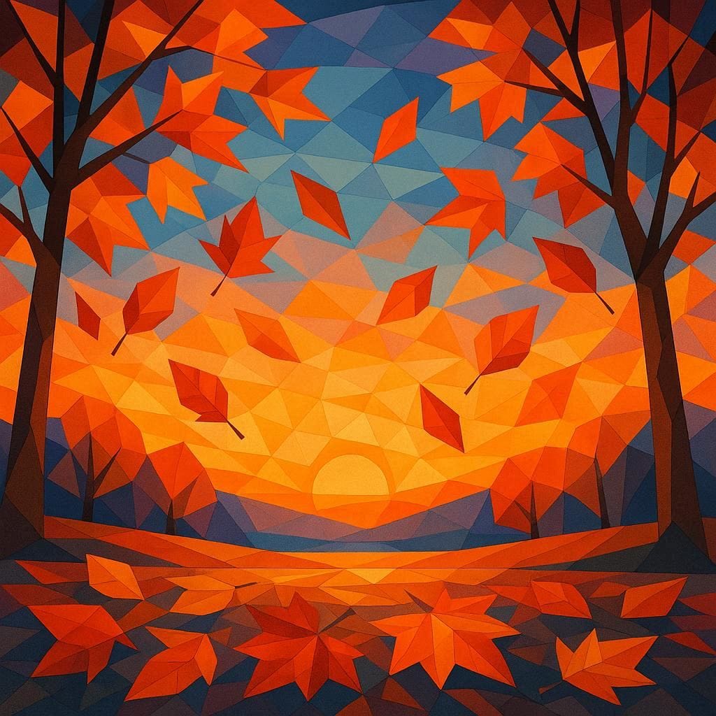 Same Prompt: Create a colorful image of leaves falling at dawn in Autumn in New England in the style of geometric art.