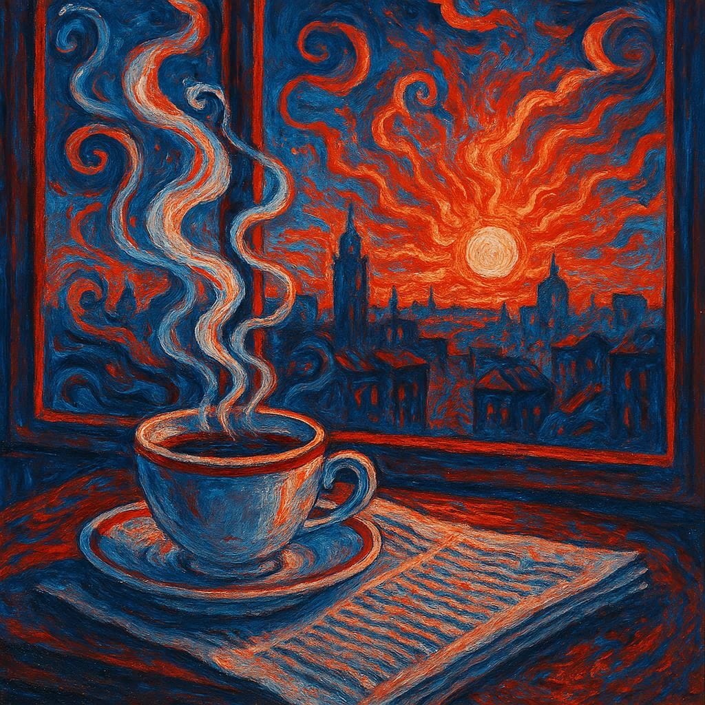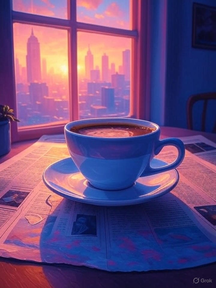 Promptly Spoke: Create an image of a cup of coffee on top of a newspaper on a table by a window during a city sunrise in the style of a magical surrealist painting using a red, white, and blue color palette.