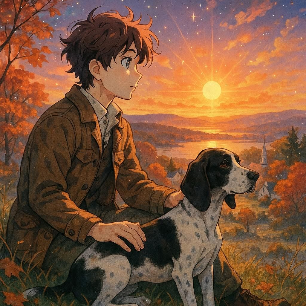 Promptly Spoke: Create an image of a man sitting watching the sunrise in New England with a black and white hound dog by his side in the style of a magical Norman Rockwell anime illustration.