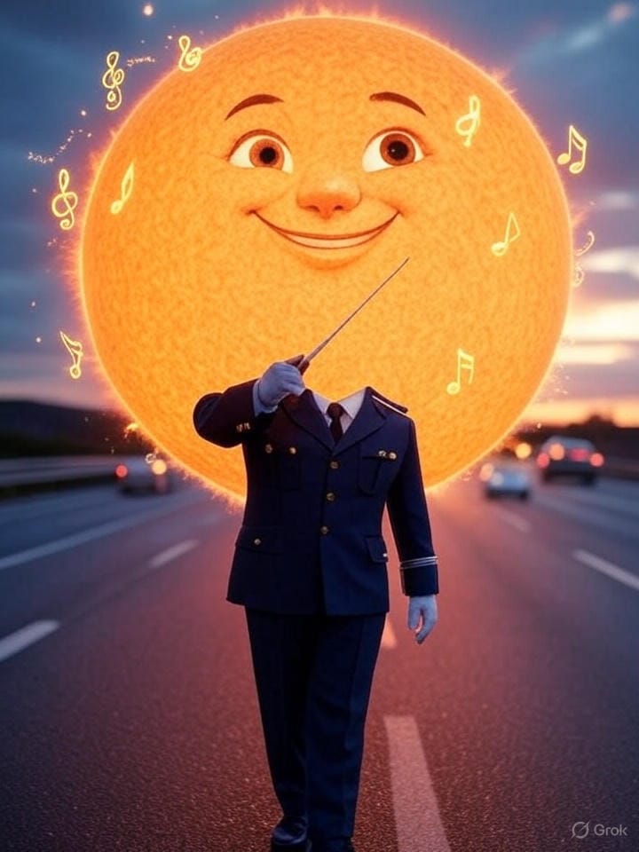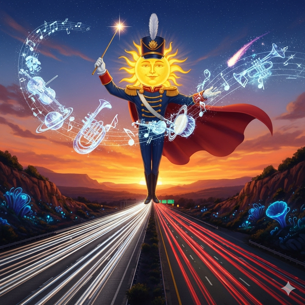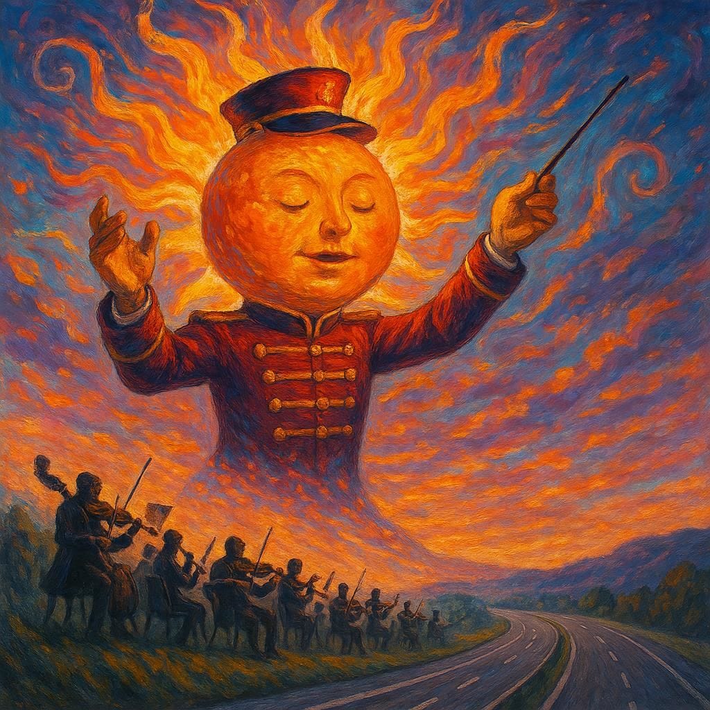 Promptly Spoke: Create an image of the Sun dressed as a band leader conducting a symphony over a highway in the style of magical abstract realism.