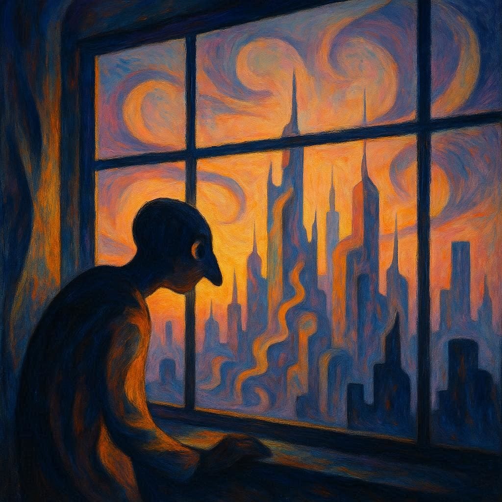Promptly Spoke: Create an image of an inquisitive person looking out a window at a city skyline at dawn in the style of a magical abstract absurdist painting using stark shadows and soft light. Same prompt. 🤔