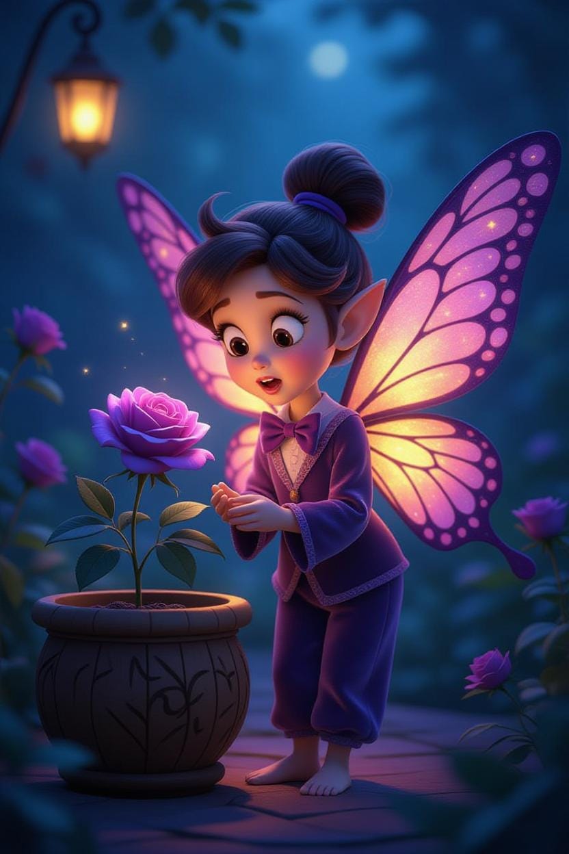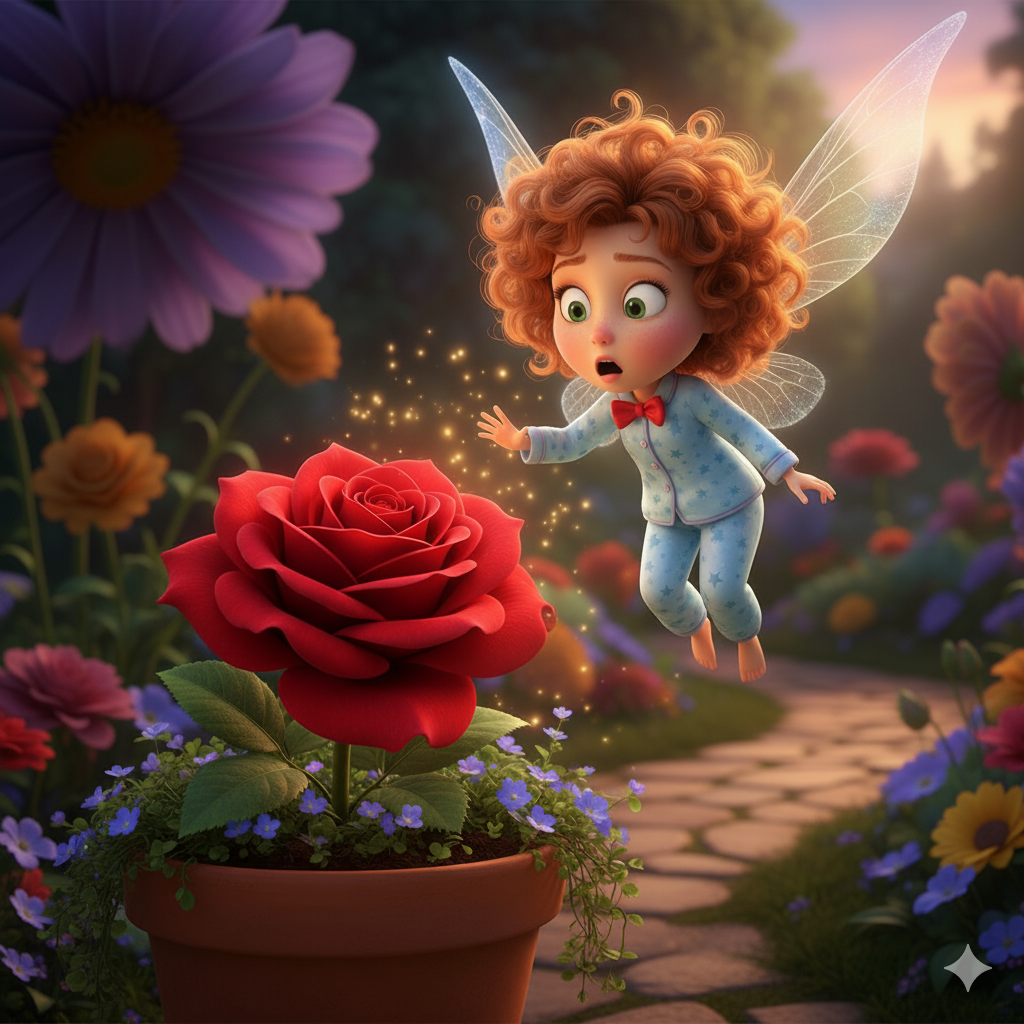 Same Prompt: Create an image of a surprised faerie wearing a bowtie and pajamas looking at a rose in bloom in a flowerpot in the style of magical Pixar animation.