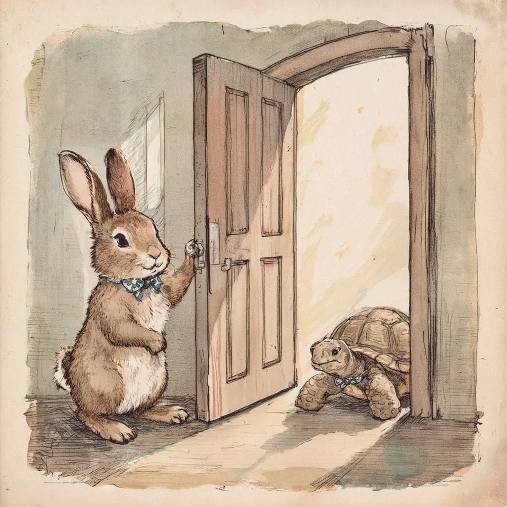 Same Prompt🤔: Create an image of a kind rabbit wearing a bowtie holding a door open for a tortoise wearing a bowtie to walk through in the style of a vintage storybook illustration.