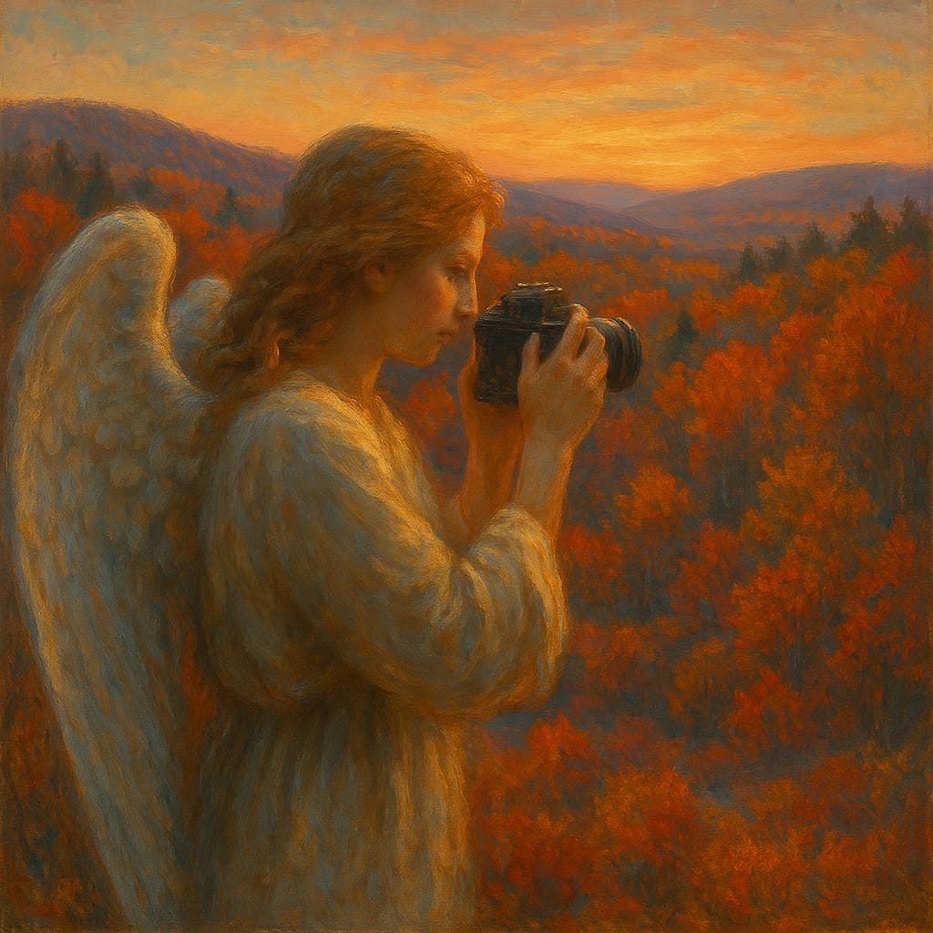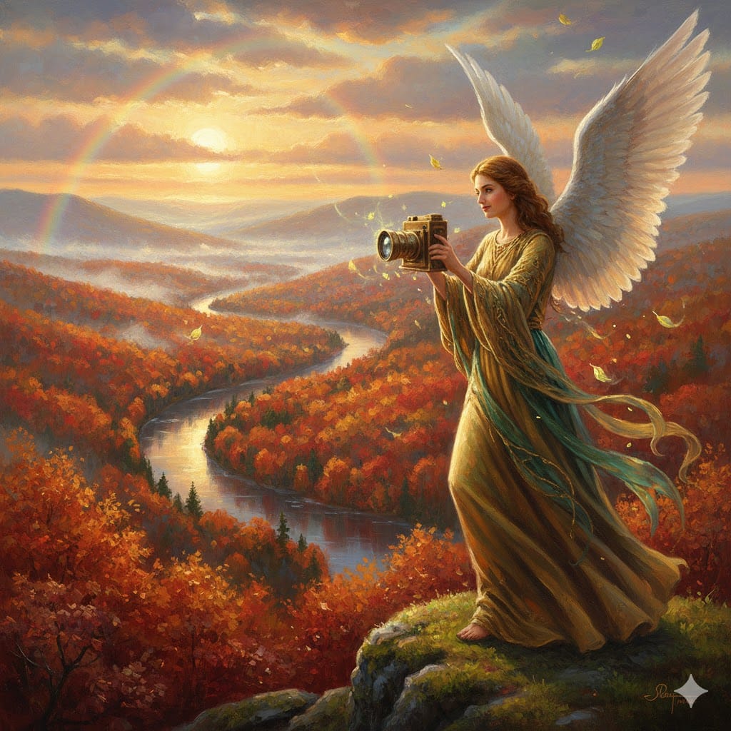 Same Prompt: Create an image of an angel holding a camera taking a picture of the foliage in Autumn in New England at Dawn in the style of a magical realism oil painting.