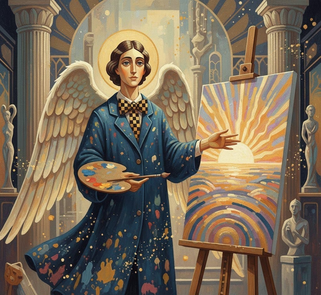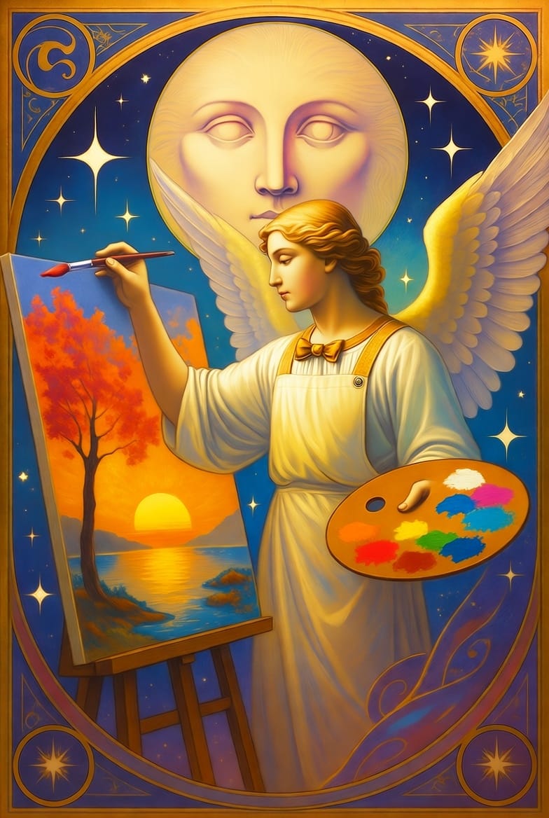 Same Prompt 🤔: Create in image of an angel wearing a bowtie and an Artist's smock painting a picture of the sunrise in the style of a magical Art Deco Expressionist Painting using soft light.