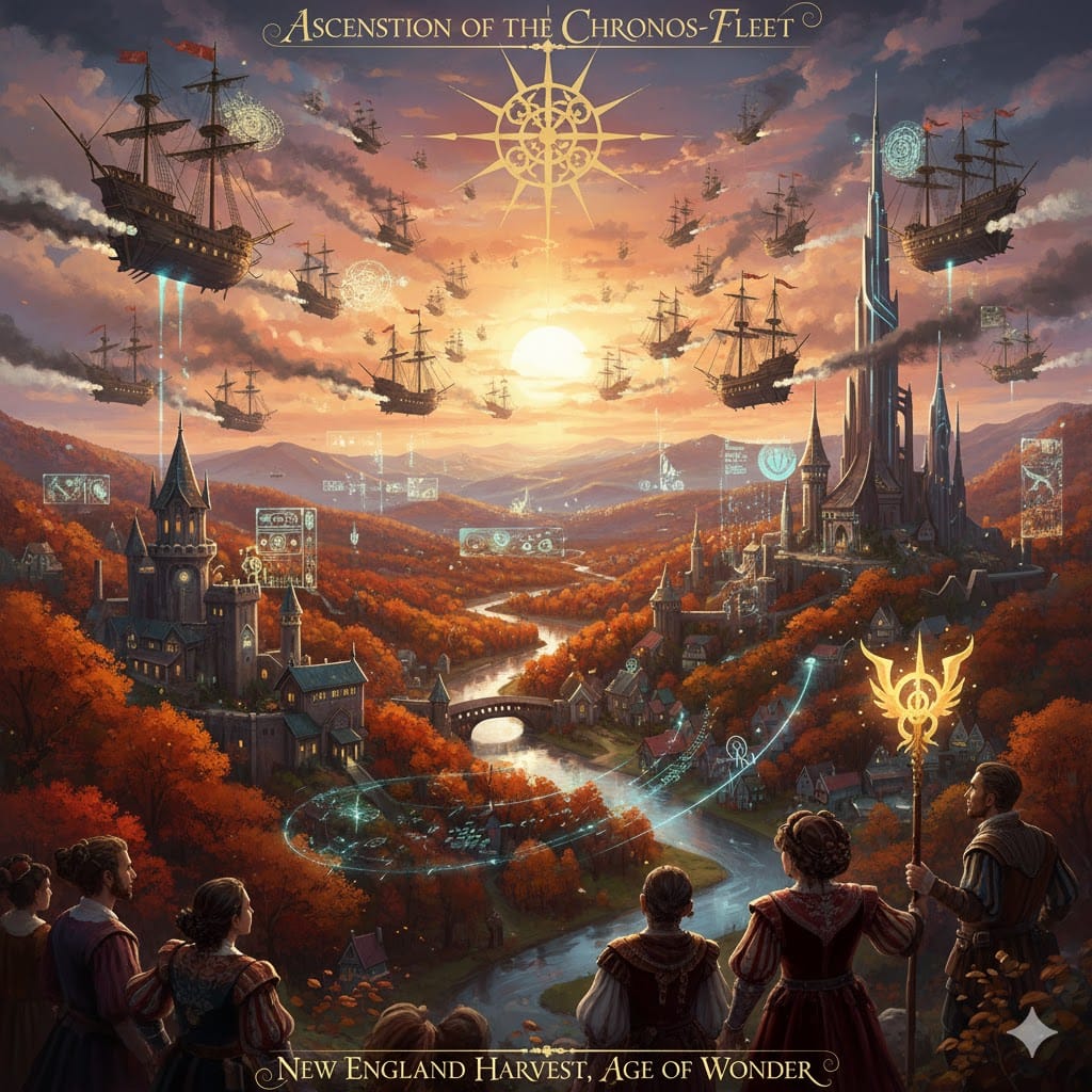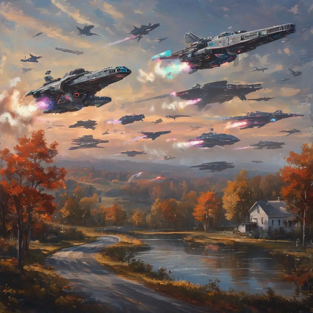 Same Prompt🤔: Create an image of an armada of spaceships coughing exhaust at dawn over a picturesque Autumn in New England landscape in the style of a magical cyberpunk Renaissance painting.