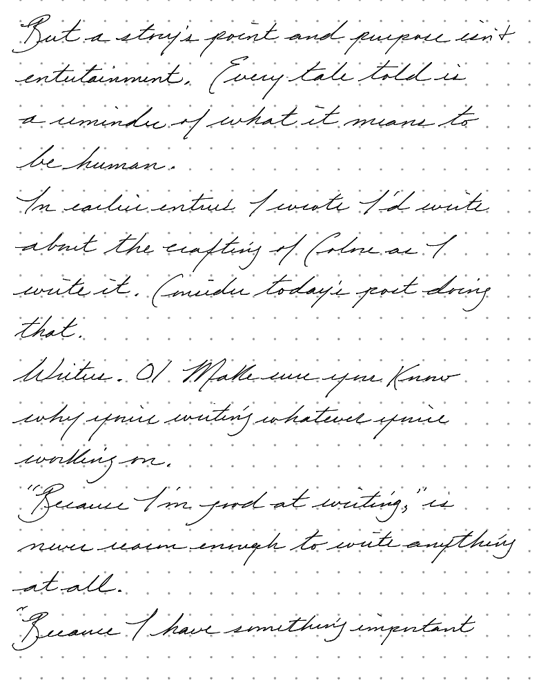 In earlier entries I wrote, like a social media artist painting a picture while you watch, I'd write about the crafting of Colore as I write it. Consider today's post doing that.
