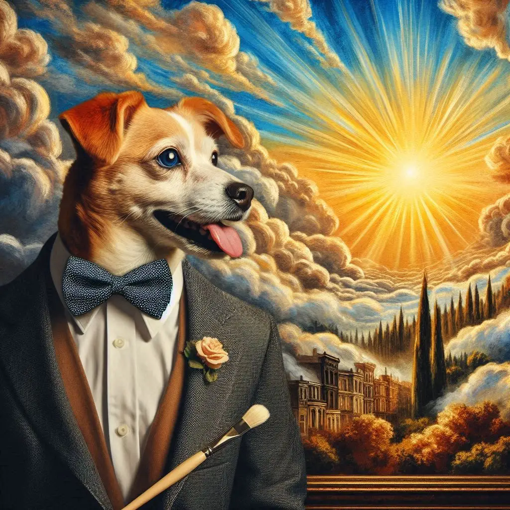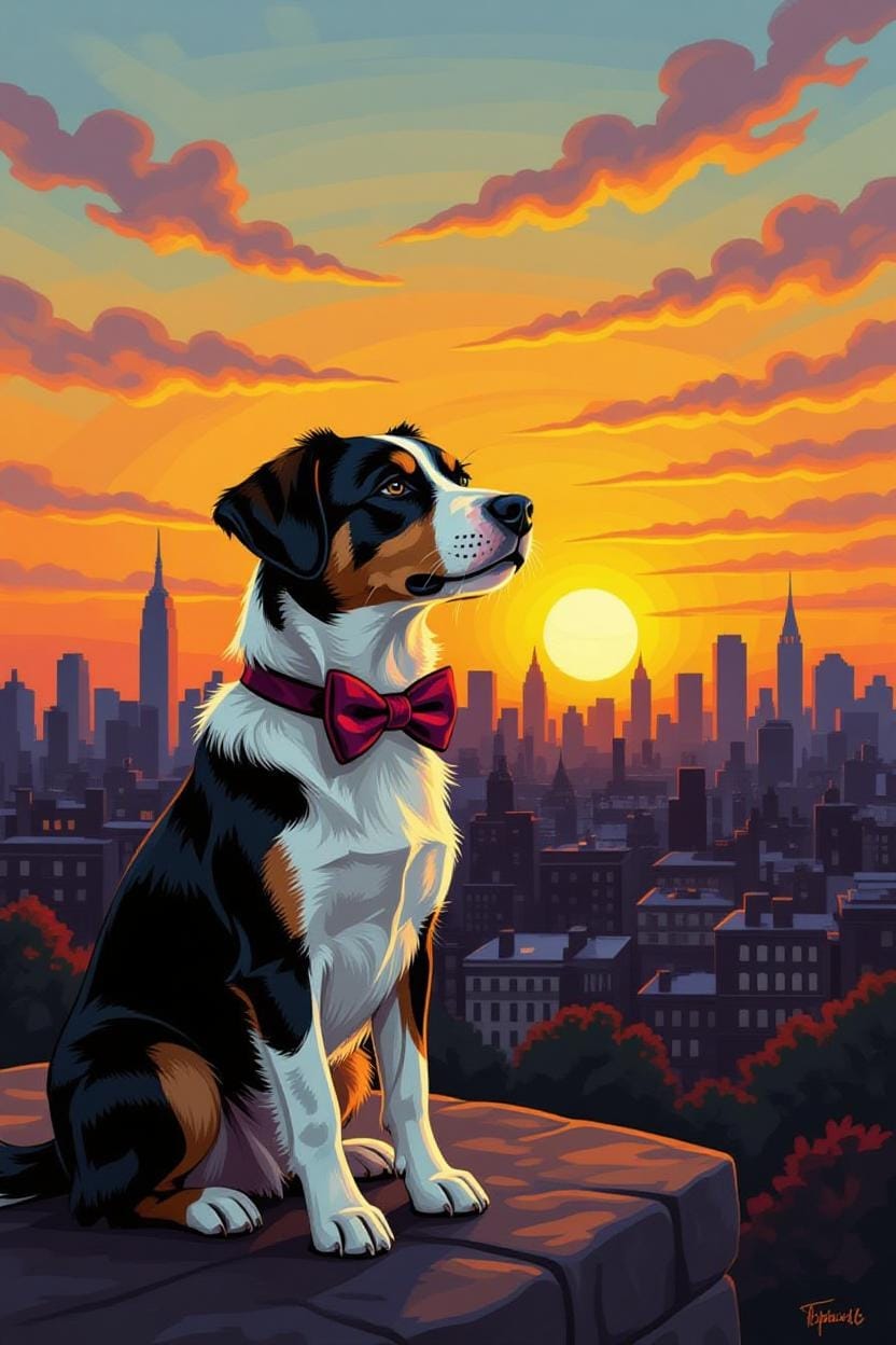 Same Prompt: Create an image of a dog wearing a bowtie while watching the sunrise in the style of a magical Harlem Renaissance Painting.