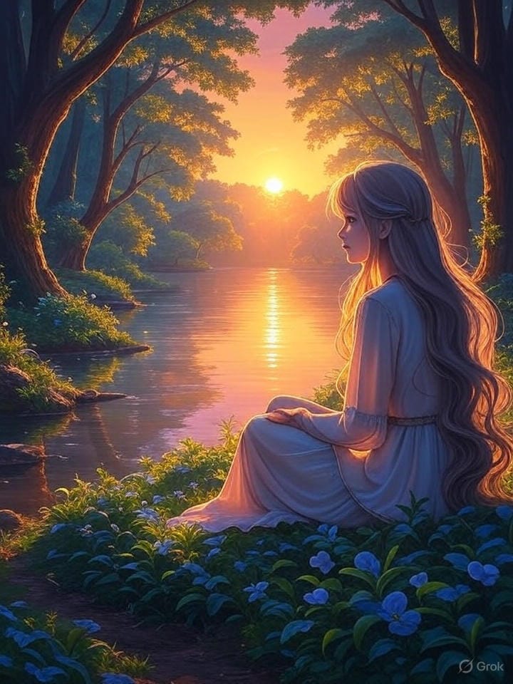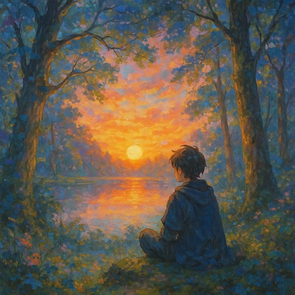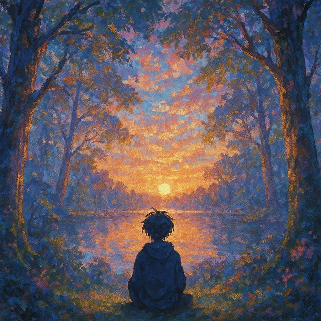 Promptly Spoke: Create an inspirational image of a person sat in an enchanted forest near a lake watching the sunrise in the style of a magical anime graphic novel impressionist painting.
