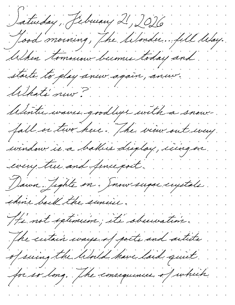 2026.02.21 The certain ways of poets and artists of seeing The World have laid quiet for so long. The consequences of which are our nightly News.