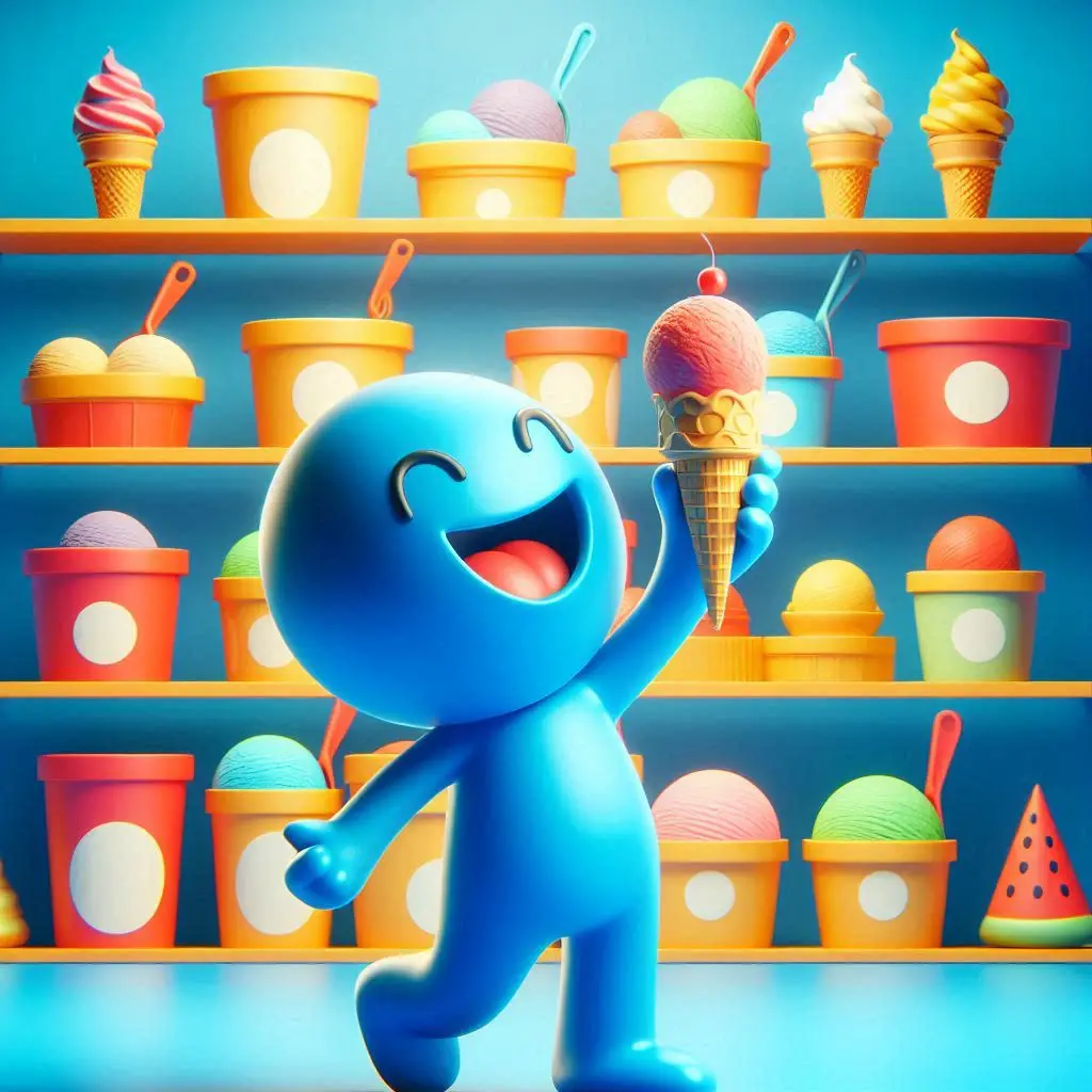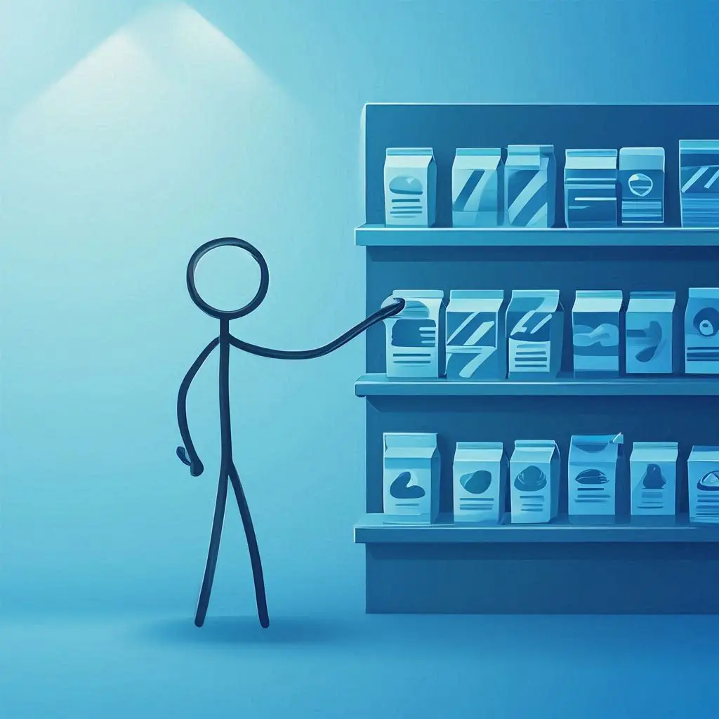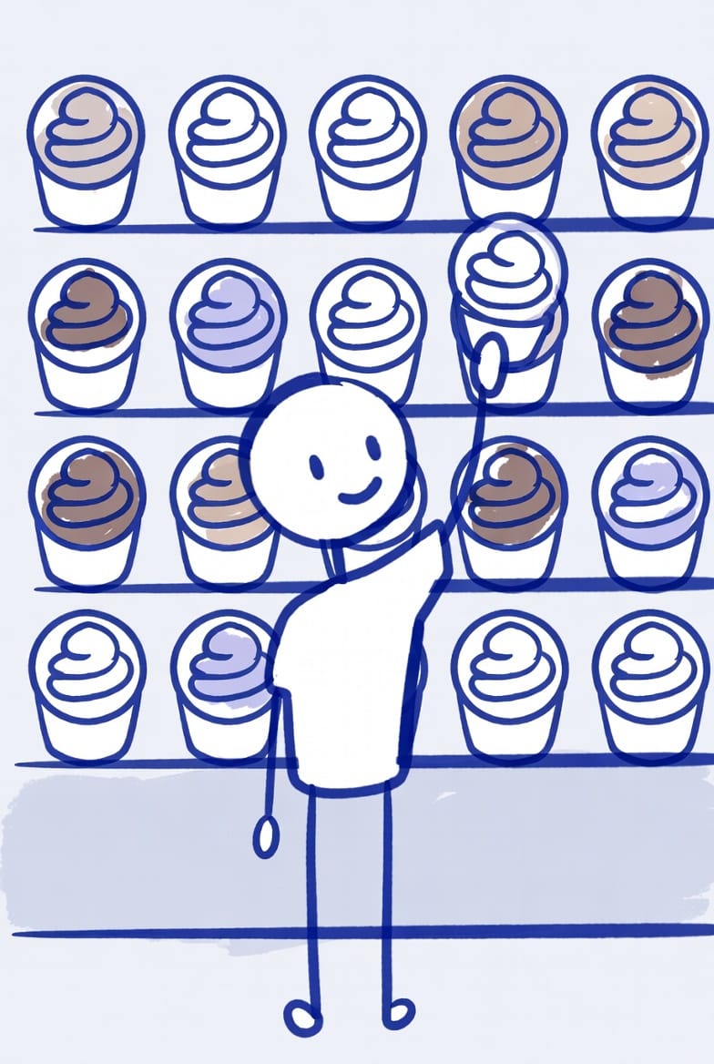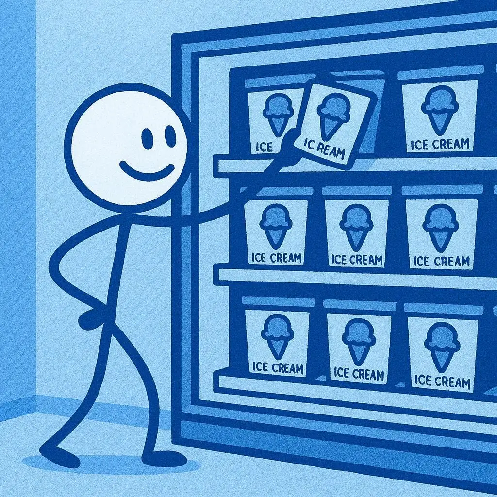 Same Prompt🤔: Create a stick figure image of someone picking out a flavor of ice cream from a store shelf using a blue color palette.