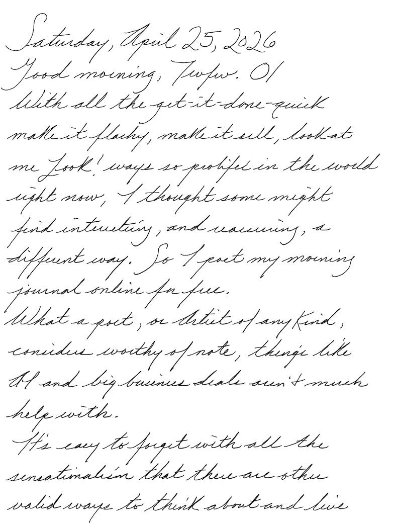 With all the get-it-done-quick make it flashy, make it sell, look at me LOOK! ways so prolific in the world right now, I thought some might find interesting, and reassuring, to be reminded there are other ways to live a good life. So I post my morning journal online for free.