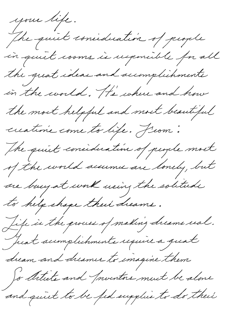 The quiet consideration of people in quiet rooms is responsible for all the great ideas and accomplishments in the world. It's where and how the most helpful and most beautiful creations come to life.