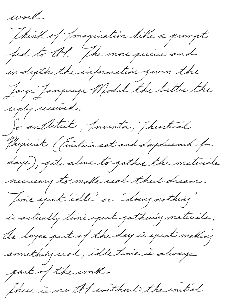 Think of Imagination like a prompt fed to AI. The more precise and in depth the information given the Large Language Model the better the reply received.