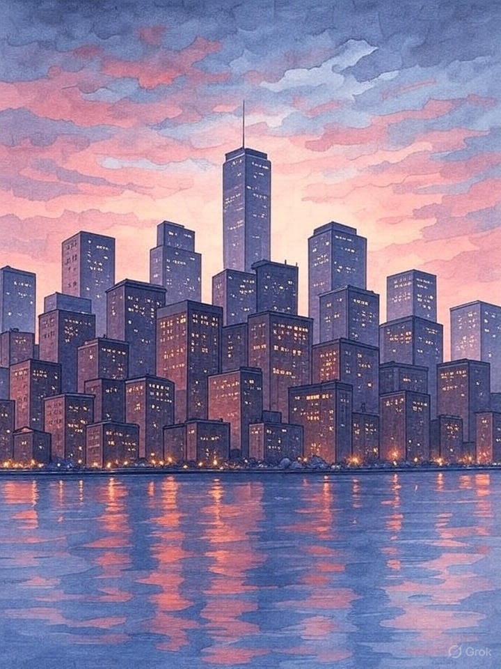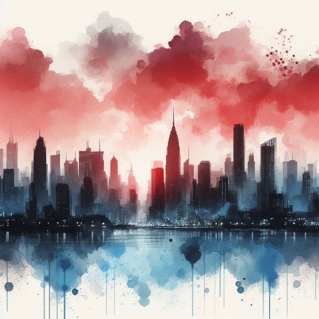 Promptly Spoken: Create an image of a somber city skyline at dawn using a red, white and blue color palette in the style of a watercolor wash